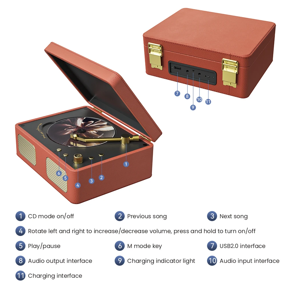 1.Tecnología de lectura avanzada:2.Fabricación de precisión artesanal:3.Exquisita arte vintage:4.Tapa protectora mejorada:Proteja sus preciados álbumes con cuidado utilizando el diseño mejorado de la tapa de nuestro reproductor de CD de escritorio, que combina estilo y protección.
