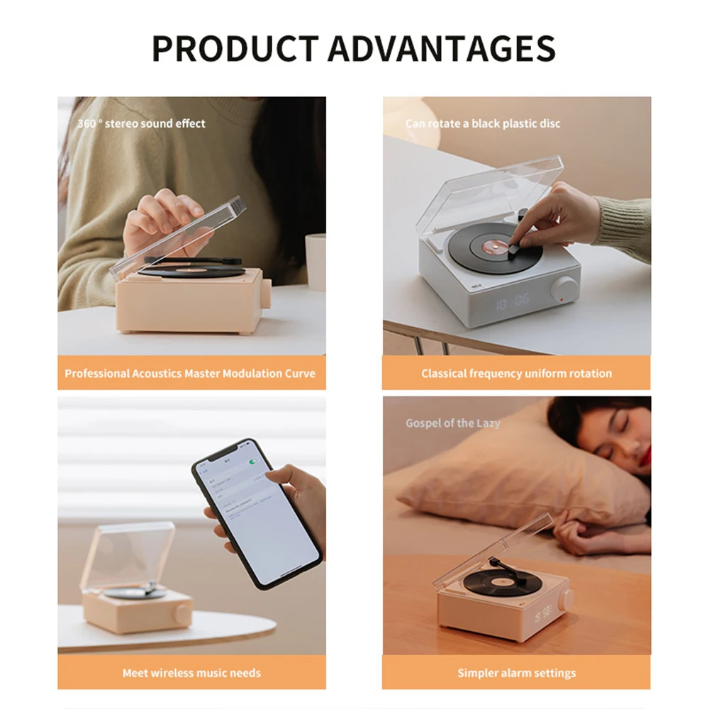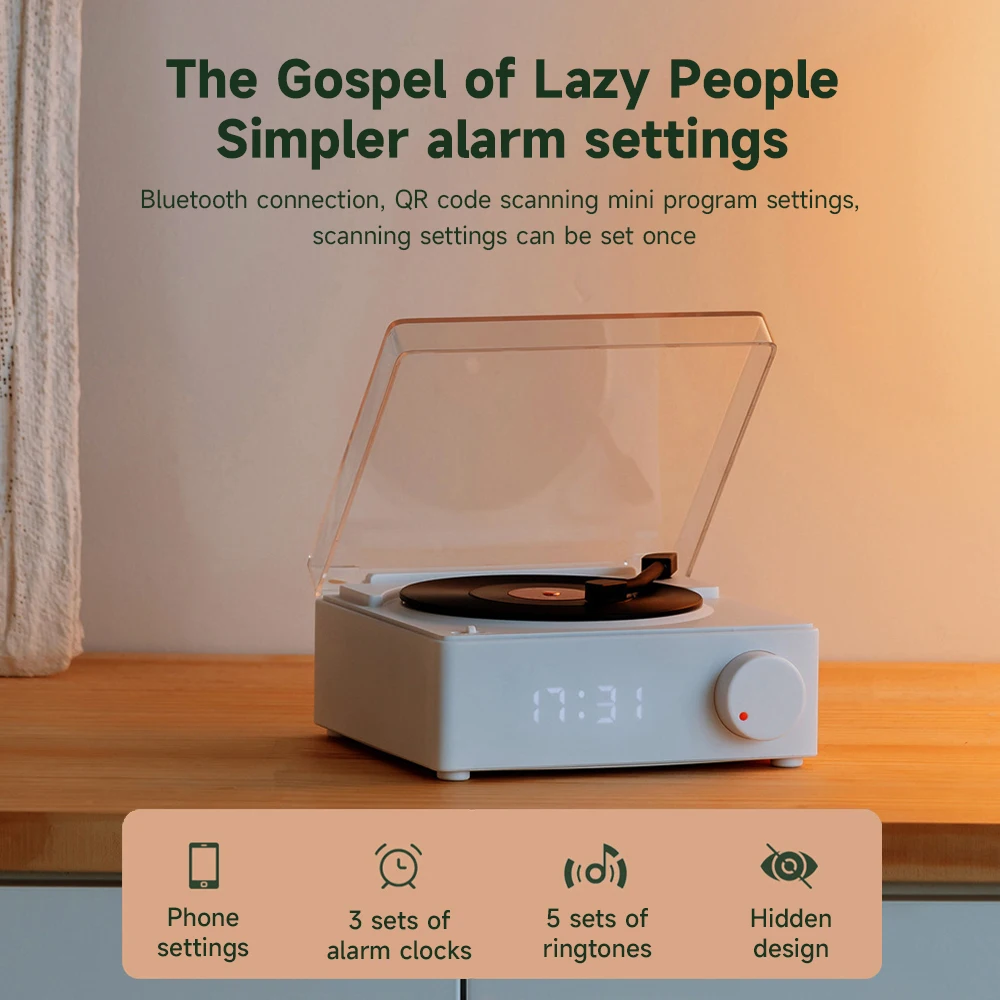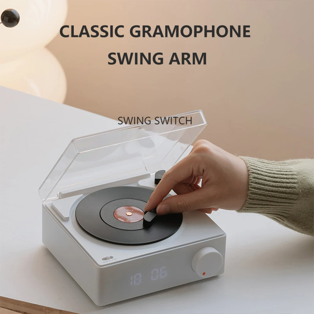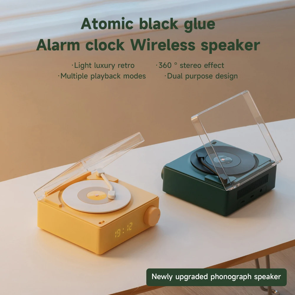 Comprar Reproductor de discos inalámbrico portátil BT 5,0, altavoz de vinilo atómico multifuncional con despertador para teléfono, escritorio, estéreo inteligente para el hogar