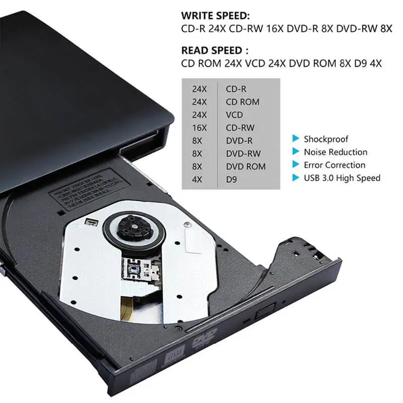 Con tecnología de reducción de ruido y bajo consumo de energía, puede ver fácilmente el vídeo DVD, copiar el archivo de música, instalar el software o crear un CD de copia de seguridad.