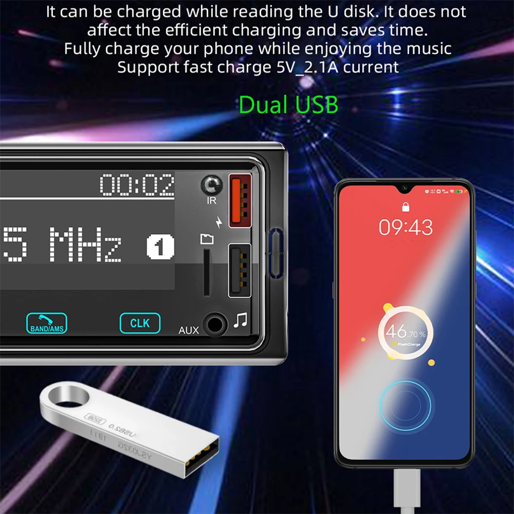 USB dual: Este reproductor MP3 para coche está diseñado con dos puertos que pueden cargar su teléfono móvil o tableta.