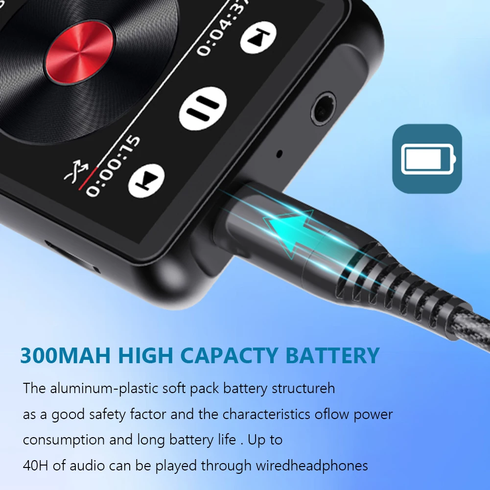 5. Reproductor MP3 multifuncional:Este reproductor de video portátil de bolsillo no es solo para música; también reproduce videos en formato AVI (requiere conversión), Radio FM, grabación en formato WAV, libros electrónicos TXT, alarma, reproducción de vídeo y navegación de imágenes. Compatible con múltiples idiomas, presenta un diseño compacto (2,72x2,13x0,47 pulgadas), compatibilidad tipo C, y una batería recargable integrada de 300mAh para un bajo consumo de energía y una larga duración de la batería. Después de una carga rápida, disfrute de hasta 40 horas de reproducción de audio con los auriculares con cable incluidos. Perfecto para el estudio, el ocio, los deportes y un regalo ideal para niños y familiares.