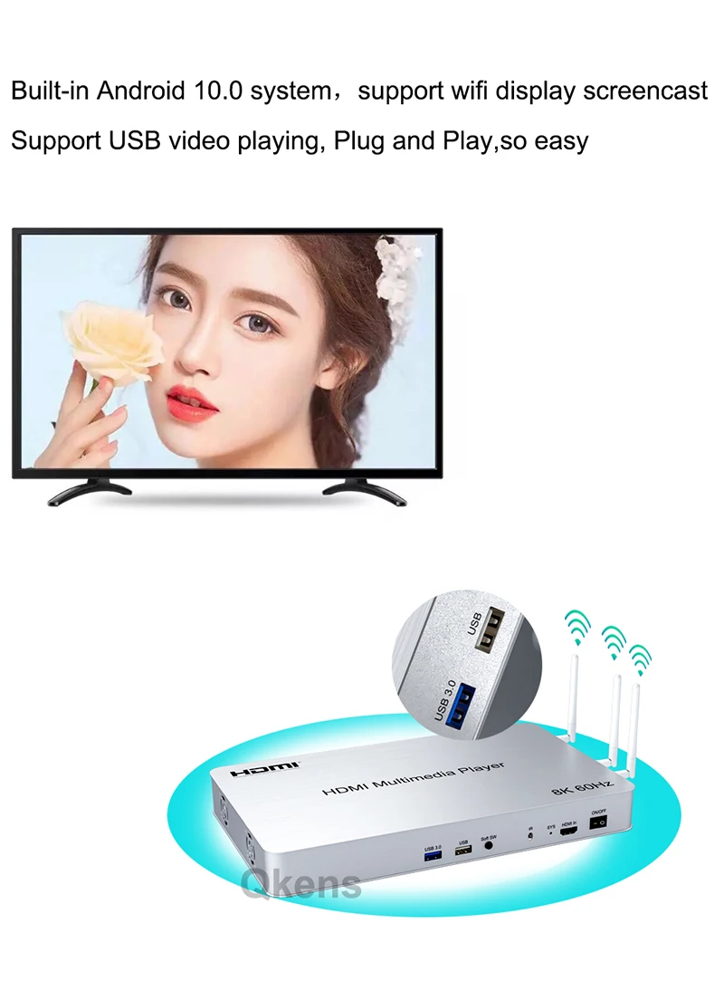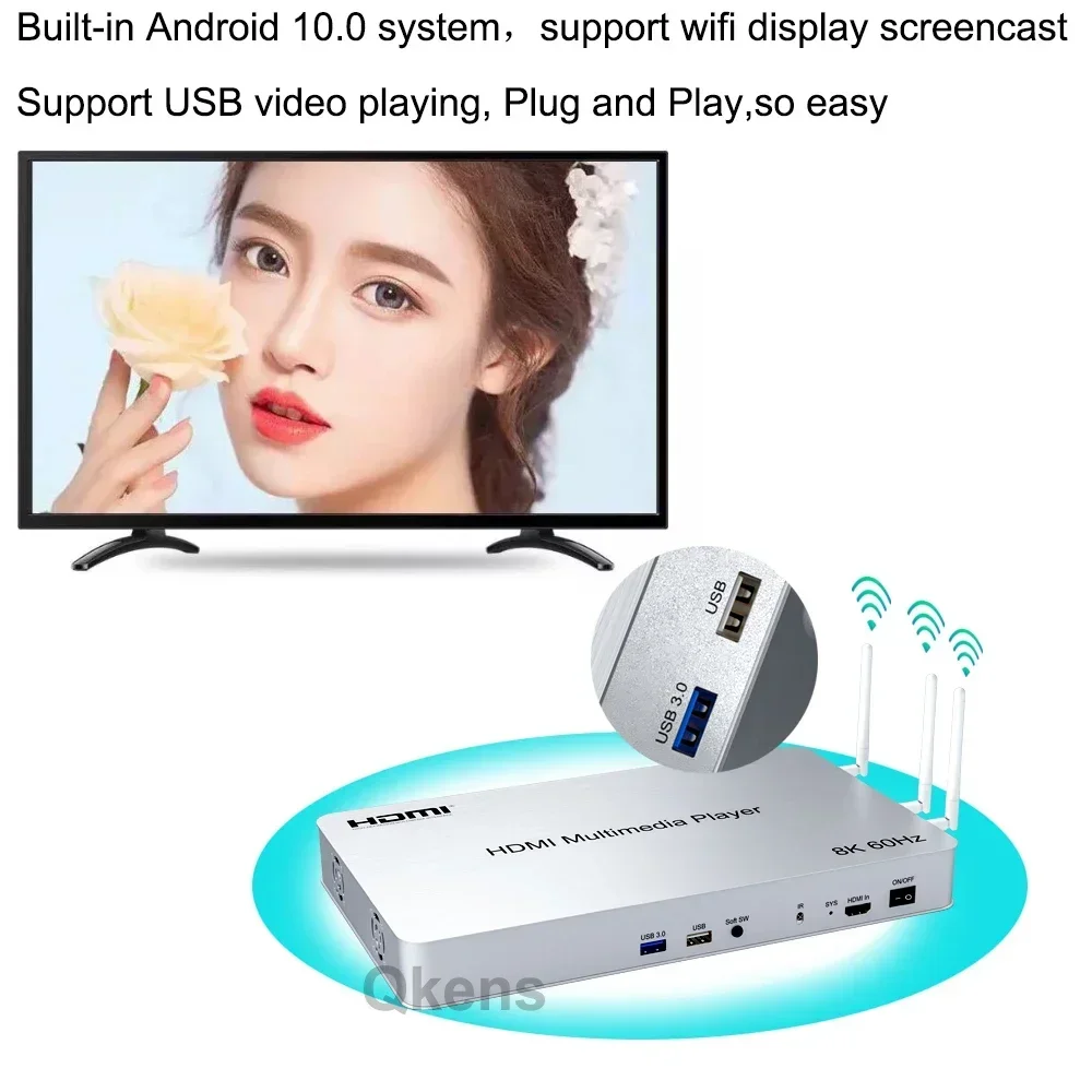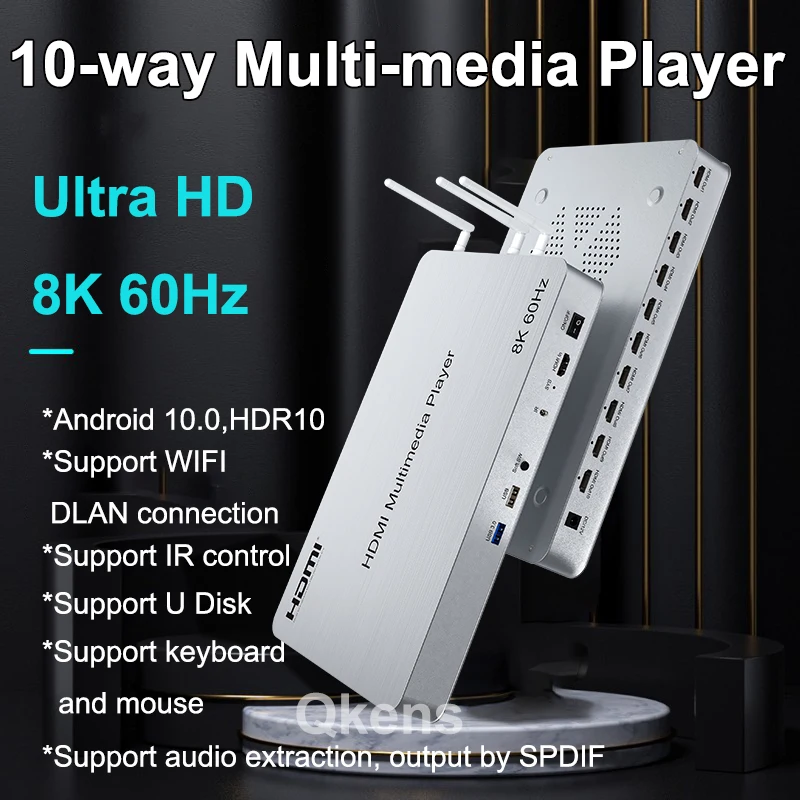 Este reproductor multimedia HDMI de 10 vías se inserta con CPU ARM Cortex A73 Octa-core y Mali GPU G25MC6,6G DDR4 RAM. Sistema Android 10,0. Admite la instalación de juegos en vivo, bajo demanda, navegación web, música y otro software, K admite 2, 4K,8K Ultra HD play.