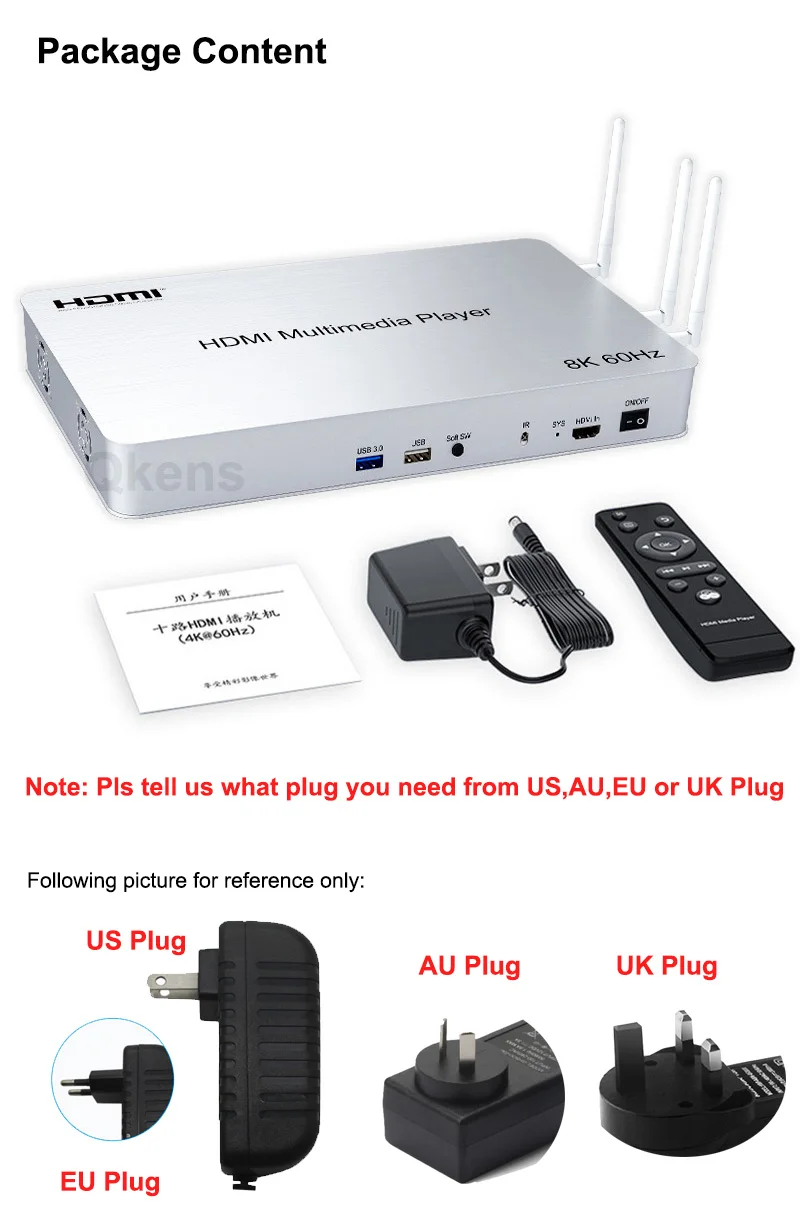 Contenido del paqueteReproductor multimedia 8K 10-Ways X1(Por favor, deje una nota de qué enchufe necesita de EE. UU., AU, UE o Reino Unido)Manual de usuario X1Control remoto sin batería X1