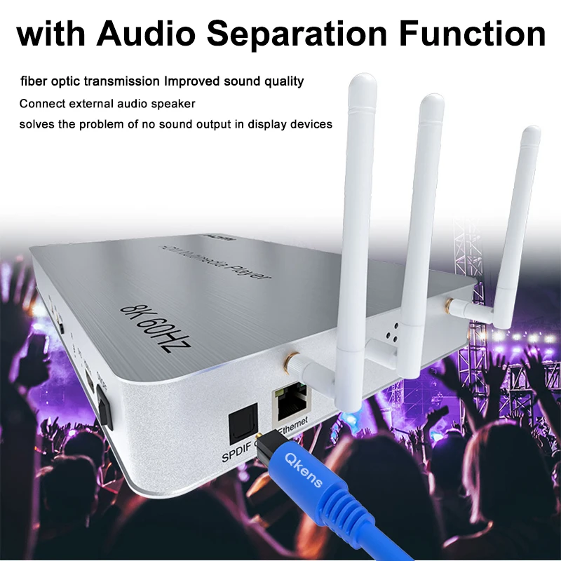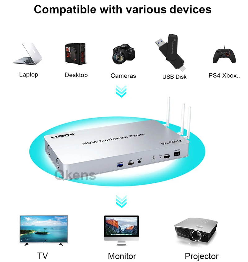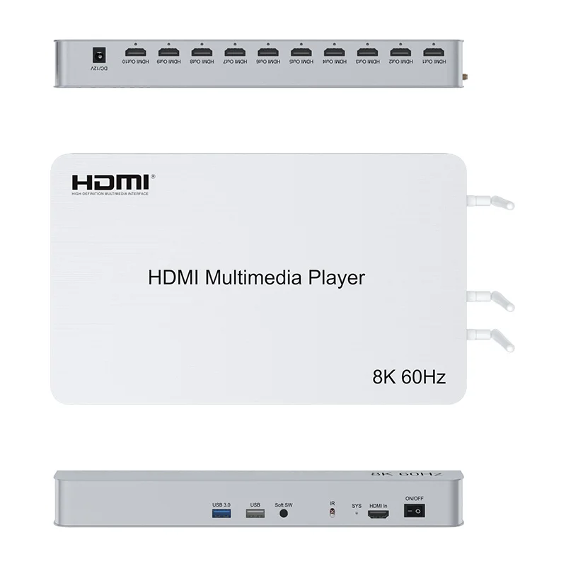 Este reproductor multimedia de 10 modos es ampliamente utilizado en tiendas de TV, proyectos y otras ocasiones.CaracterísticasSoporte HDR10;Soporta resolución de hasta 8K @ 60Hz;Admite salida máxima de ancho de banda de 48Gbps;Soporta 8/10/12 de espacio de color;Admite conexión WIFI, DLAN;Compatible con sistema Android 10,0, compatible con pantalla WiFi;Admite Extracción de audio, Salida por SPDIF;Transmisión USB bidireccional, compatible con reproducción de vídeo USB y actualización USB;Admite salida HDMI de 10 vías simultáneamente;Admite control IR;Admite teclado y ratón USB;Admite la configuración de resolución a través del control remoto o el ratón USB;EspecificacionesResolución de entrada HDMI: máxima 8K/60HzResolución de salida HDMI: máxima 8K/60HzFormato de audio compatible: EstéreoDistancia del cable de entrada: 8K/60Hz ≤ 5M HDMI 2,1 cable estándarDistancia del cable de salida: cable estándar HDMI 2,1 de 8K/60Hz ≤ 5MCorriente máxima de trabajo: 1.8AAdaptador de corriente: entrada CA (50HZ, 60HZ) 100V-240V; Salida: CC 12V/2A