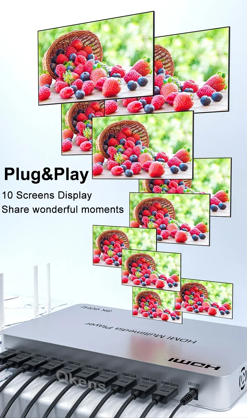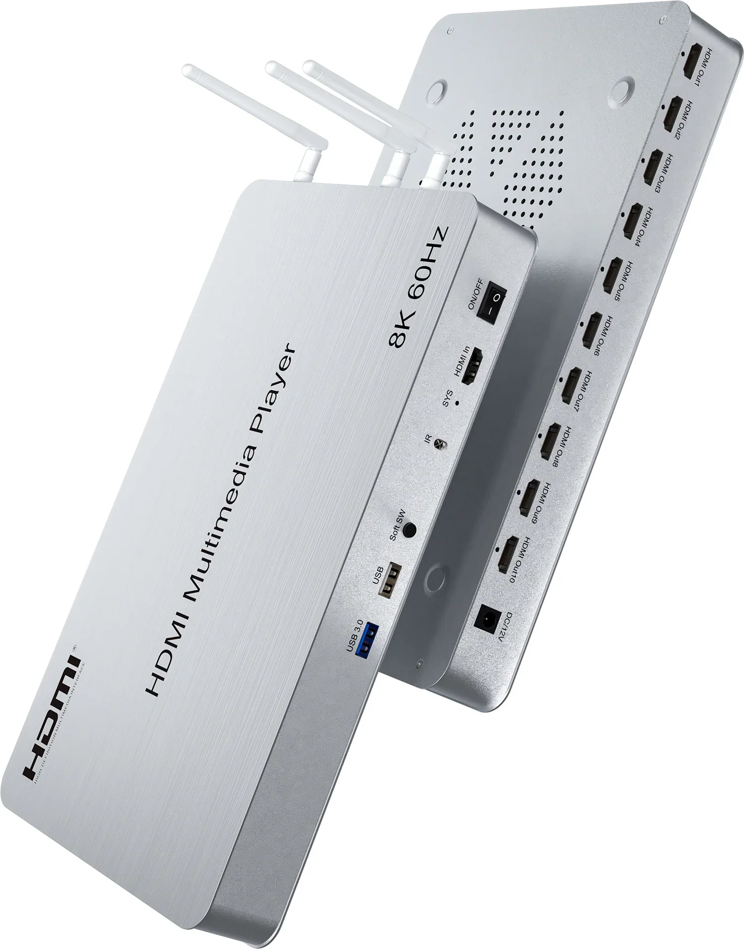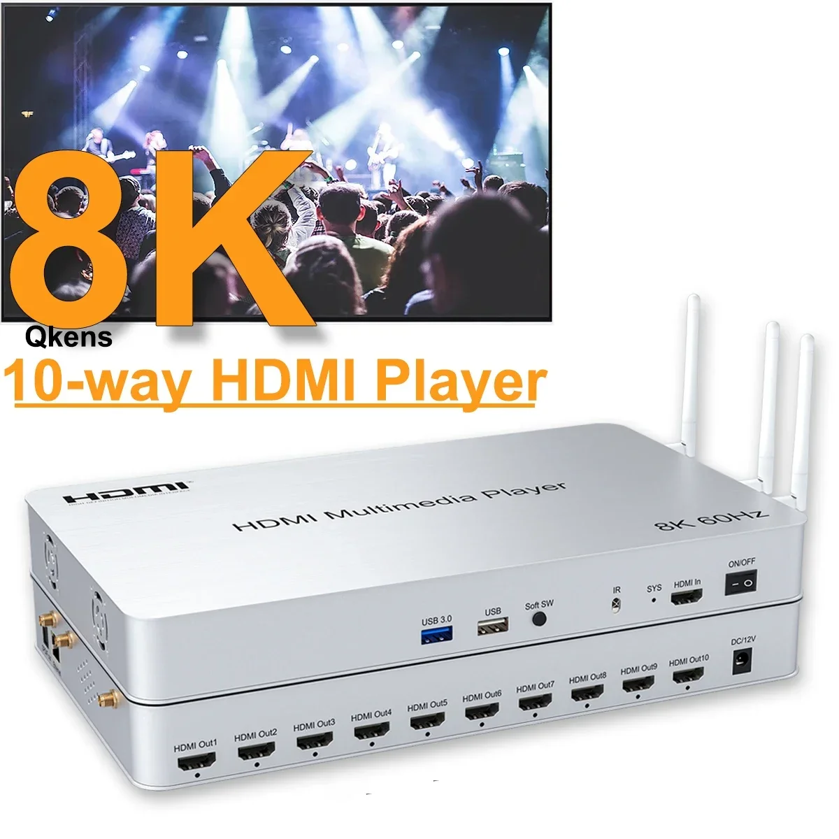 Este reproductor multimedia de 10 modos es ampliamente utilizado en tiendas de TV, proyectos y otras ocasiones.CaracterísticasSoporte HDR10;Soporta resolución de hasta 8K @ 60Hz;Admite salida máxima de ancho de banda de 48Gbps;Soporta 8/10/12 de espacio de color;Admite conexión WIFI, DLAN;Compatible con sistema Android 10,0, compatible con pantalla WiFi;Admite Extracción de audio, Salida por SPDIF;Transmisión USB bidireccional, compatible con reproducción de vídeo USB y actualización USB;Admite salida HDMI de 10 vías simultáneamente;Admite control IR;Admite teclado y ratón USB;Admite la configuración de resolución a través del control remoto o el ratón USB;EspecificacionesResolución de entrada HDMI: máxima 8K/60HzResolución de salida HDMI: máxima 8K/60HzFormato de audio compatible: EstéreoDistancia del cable de entrada: 8K/60Hz ≤ 5M HDMI 2,1 cable estándarDistancia del cable de salida: cable estándar HDMI 2,1 de 8K/60Hz ≤ 5MCorriente máxima de trabajo: 1.8AAdaptador de corriente: entrada CA (50HZ, 60HZ) 100V-240V; Salida: CC 12V/2A