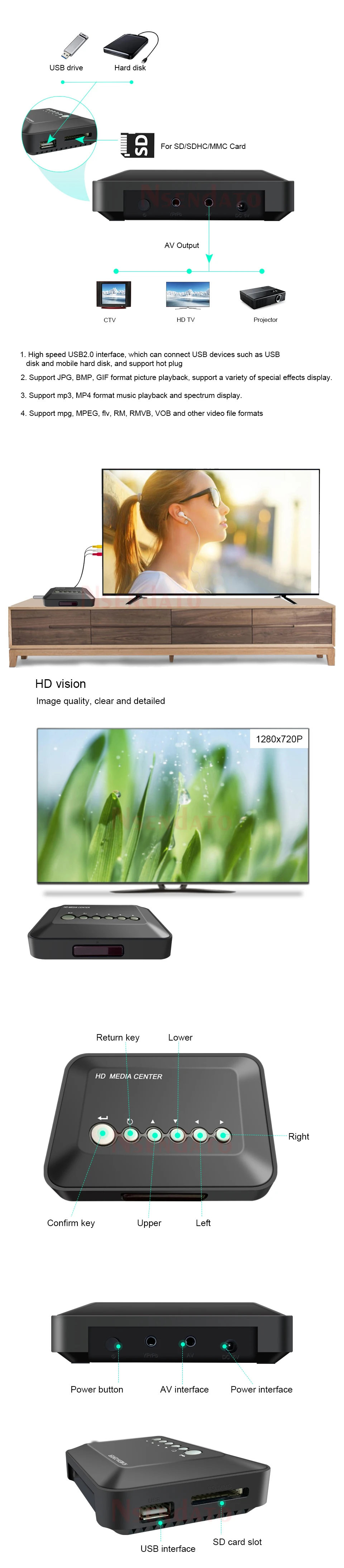 Comprar Reproductor Multimedia Mini Full HD de 720P, dispositivo USB externo HDD, H.264, para SD MMC U Disk AV YPrPb, Salida para MKV RMVB