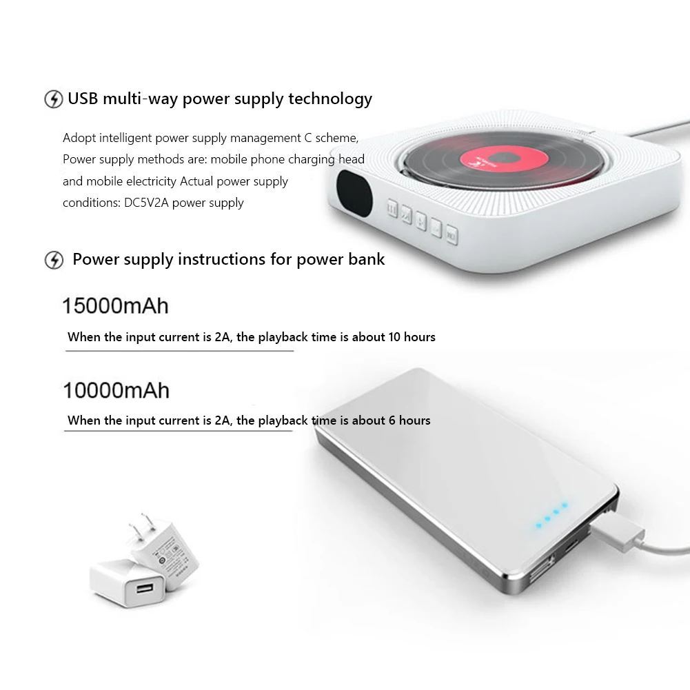 5. With Wall Mounting Kit and Bracket: It can be easily installed on the wall or stand on the table, it is a perfect decoration for walls and tables. Wireless infrared remote control is very convenient to use in home entertainment, or office meetings, and the operation is simple. With LED display. It is easy to know the current playback mode. Equipped with CD dust cover, simple white appearance, to prevent dust from affecting the sound. USB multi-way power supply technology. The intelligent power supply management IC solution is adopted. The power supply methods are: mobile phone charging head and mobile power supply. The actual power supply conditions: DC 5V/2A power supply.