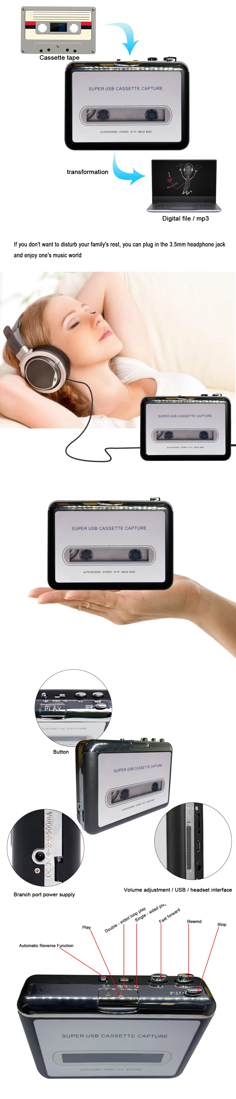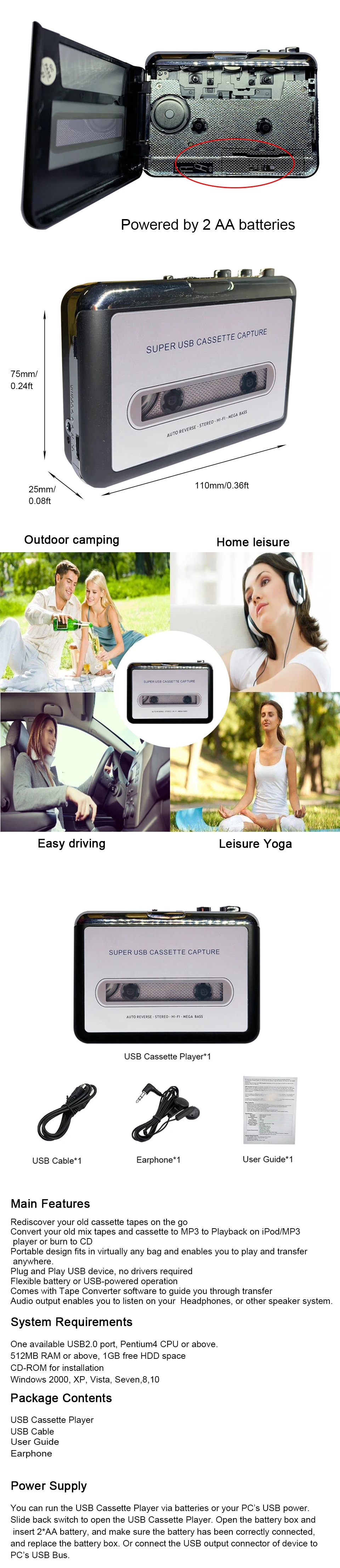 Main Features:- Easily transfer any cassette tape to audio CD or MP3- Burn recording transferred to audio CD- Automatically stop recording after preset amount of time and split recording into individual audio tracks- Remove hiss, sound of clicks and other noise- Saved as WAV or MP3 audio files- Portable design enables you to play and transfer anywhere- Plug and play USB powered operation- Audio output enables you to listen on stereo, headphone, or other speaker systemPackage Contents:1 x Cassette To MP3 Player Converter,1 x USB Cable,1 x Earphones,1 x English User Manual