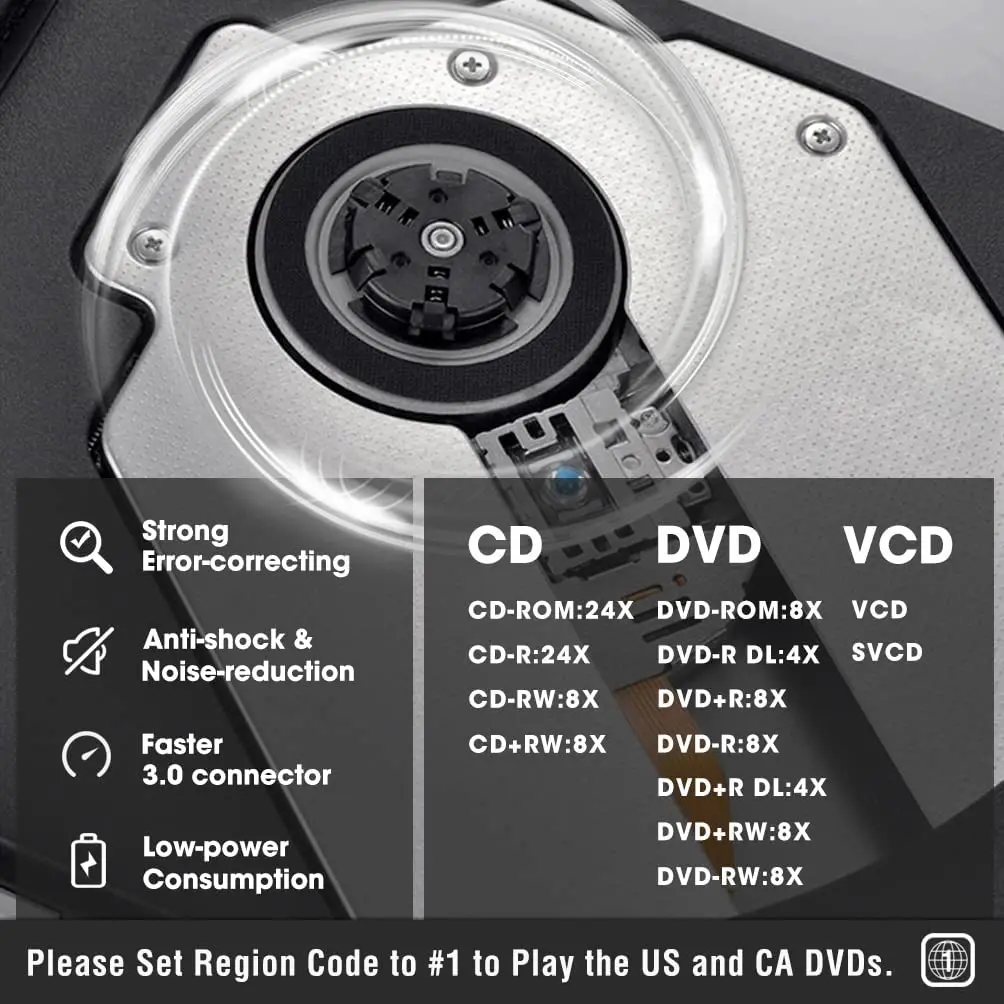 【Rendimiento fiable】Con la fuerte corrección de errores, baja impedancia y capacidad anti-interferencia, puede usar esta unidad de CD/DVD USB para leer y escribir CD y DVD silenciosamente sin tartamudeo ni ruido, y no dañará sus discos.