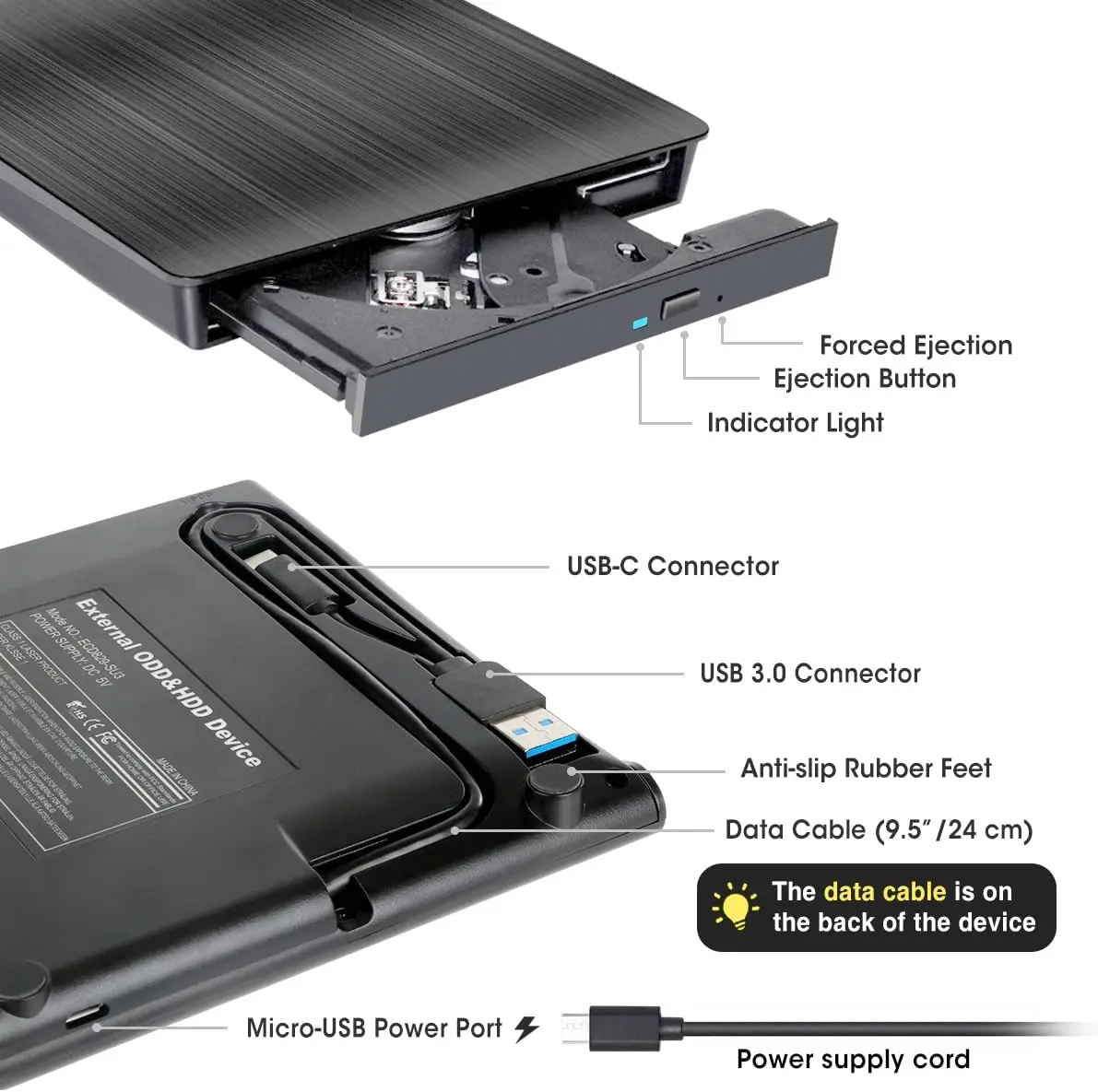 CD externo DVD RW Drive Burner USB 3,0 Tipo-C CD/DVD portátil Unidad óptica Reproductor Lector Escritor para computadora portátil Escritorio Windows 8