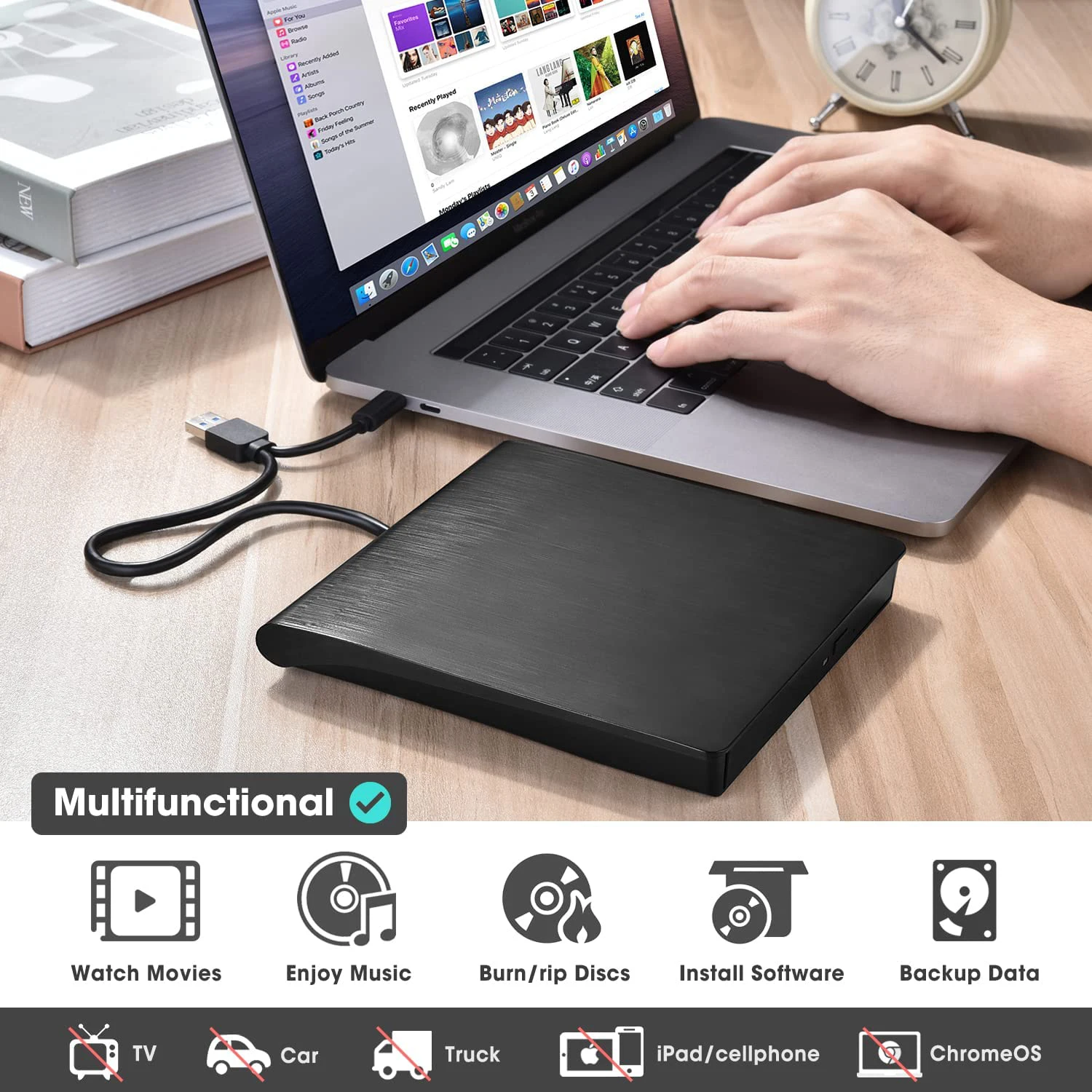 【Compatible con múltiples OS】Compatible con Windows 11/ 10/8,1/7/ XP, Linux y todas las versiones de Mac OS, por lo que puede usar esta unidad óptica externa en casi todos los ordenadores, incluido el MacBook Pro, macBook Air, iMac, Mac Mini, portátiles Windows y ordenadores de sobremesa (NOTA: NO es compatible con Chromebook, TV, iPad, Camión y coche).