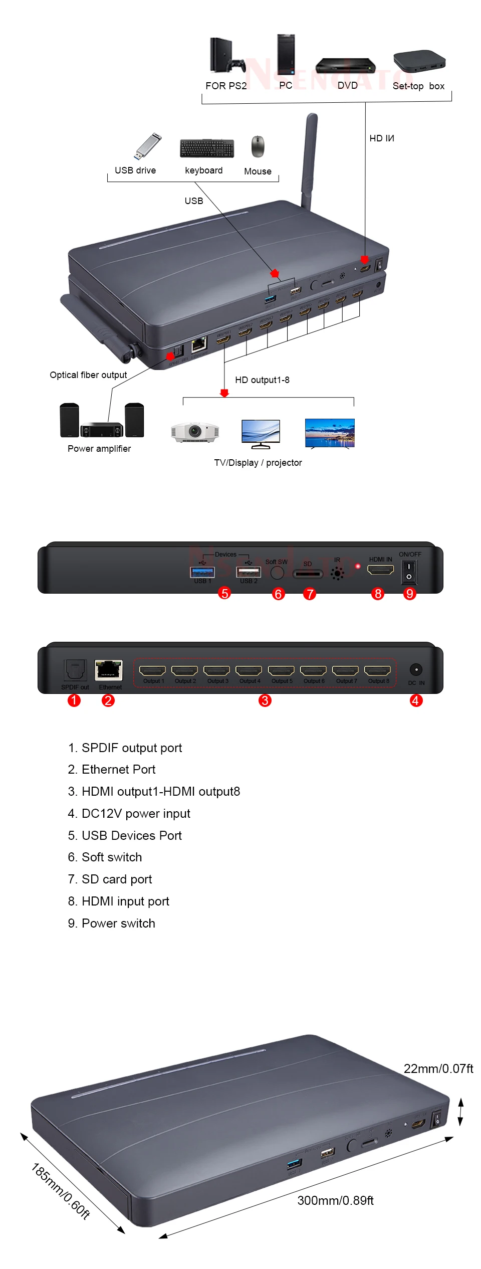 * Compatible con HDMI 1.4* Admite resolución de hasta 4kx2k@30HZ* Admite la velocidad máxima en baudios de 3G y el ancho de banda máximo de 300 Mhz* Admite conexión WIFI y DLAN* Admite espacio de color 8/10/12* Admite cable estándar HDMI AWG26: entrada de hasta 8 metros, salida de hasta 8metros (4K/1080P)* Sistema Android 5.0 integrado, compatible con pantalla screencast* Admite extracción de audio, salida por SPDIF* Admite 2 entradas USB 2.0, utilizadas para reproducción y actualización de video USB* Admite 1 Micro SD, utilizado para reproducción de vídeo en tarjeta SD* Admite salidas HDMI de 8 vías simultáneamente* Admite enchufar y desconectar el disco duro SATA sin abrir la tapa* Admite control IR* Admite configuración de resolución a través de IR o mouse USBAccesorios del paquete:1 reproductor multimedia de 8 vías.1 adaptador de corriente de 12 V/2 A.1x manual de usuario1x control remoto con batería