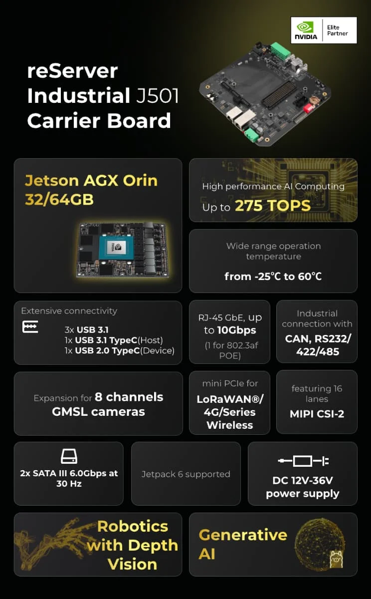 ReServer Industrial J501Tablero portador para Jetson AGX Orin