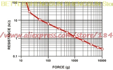 Como hemos dicho, FSR con cada vez más presión en el cambio de resistencia, cuando no hay sensor de presión parece una resistencia infinita (Abierta), con el aumento de la presión y la resistencia disminuida. El gráfico muestra la medición del sensor de resistencia con diferentes valores de presión.