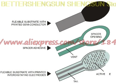 FSR está separado por 2 capas, con el aumento de presión, los elementos de estos puntos activos tocarán el semiconductor, por lo que la resistencia se vuelve pequeña