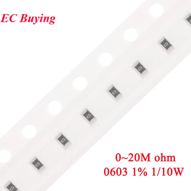Comprar Resistencia SMD de 100 piezas, 1%, 0603, 0R ~ 20M, 1/10W, 0,1, 0,22, 10, 100, 150 ohm, 1K, 220 K, 10K, 330 K, 0.1R, 1R, 10R, 100R, 150R, 220R, 330R, 1M