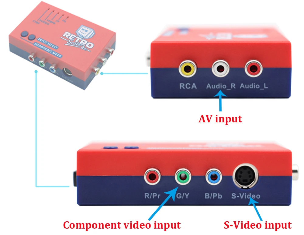 2.Soporte RetroScaler2Xcomponente / AV/ SVentrada de señal.Antes de comprar, confirme si su consola de juegos puede emitir estas tres señales de video.