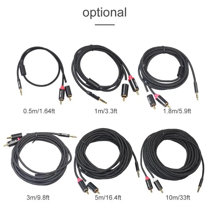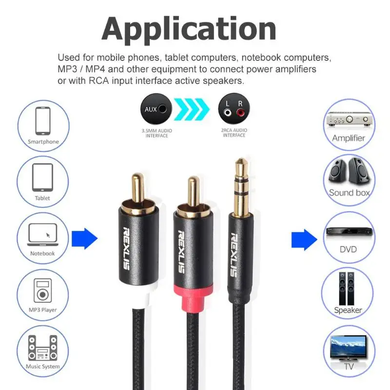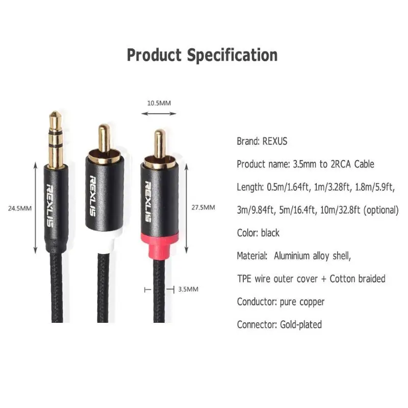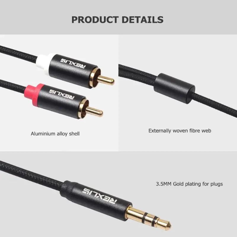 Comprar REXUS-Cable de Audio RCA de 3,5mm, conector macho a 2 RCA, Cable auxiliar de algodón trenzado para altavoz de cine en casa, 0,5 m, 1,0 m, 1,8 m, 3m