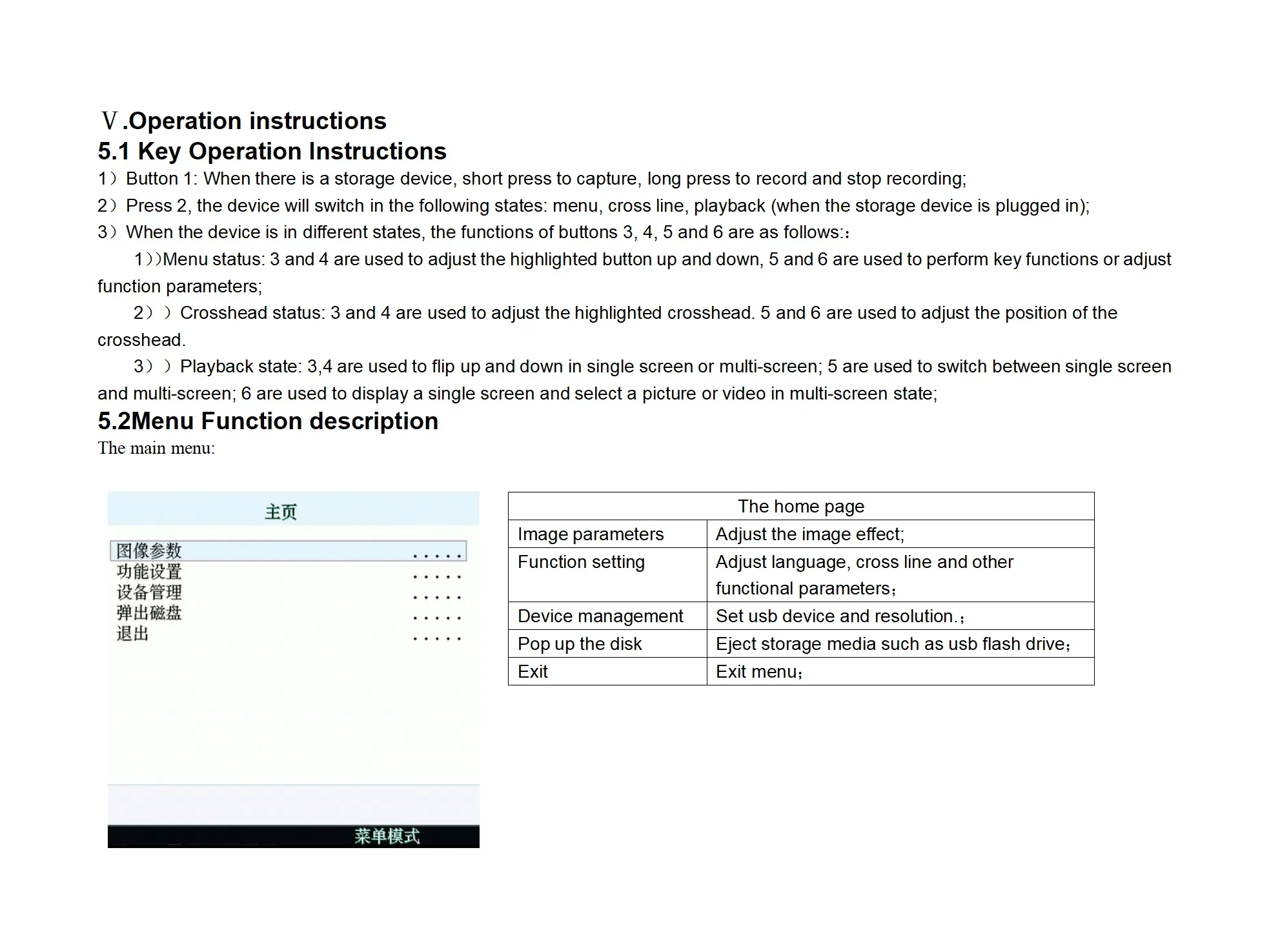 Presione la tecla MEMU una vez para abrir el menú principal.Después de abrir el menú principal, puede ver los parámetros de la imagen, la configuración de funciones, la administración del dispositivo, el disco emergente y salir del submenú.Utilice el▲/▼ Teclas para mover el cursor para seleccionar el submenú que ingrese y luego presione la tecla+ para ingresar al submenú indicado por el cursor.Después de ingresar al submenú, utilice la tecla "+/-" para ajustar el valor.El valor predeterminado en los parámetros de la imagen es "balance de blancos automático" y se requiere "balance de blancos con un botón".Primero configure "balance de blancos automático" en "NO", coloque un trozo de papel blanco debajo de la lente y luego active el elemento "balance de blancos con un botón".
