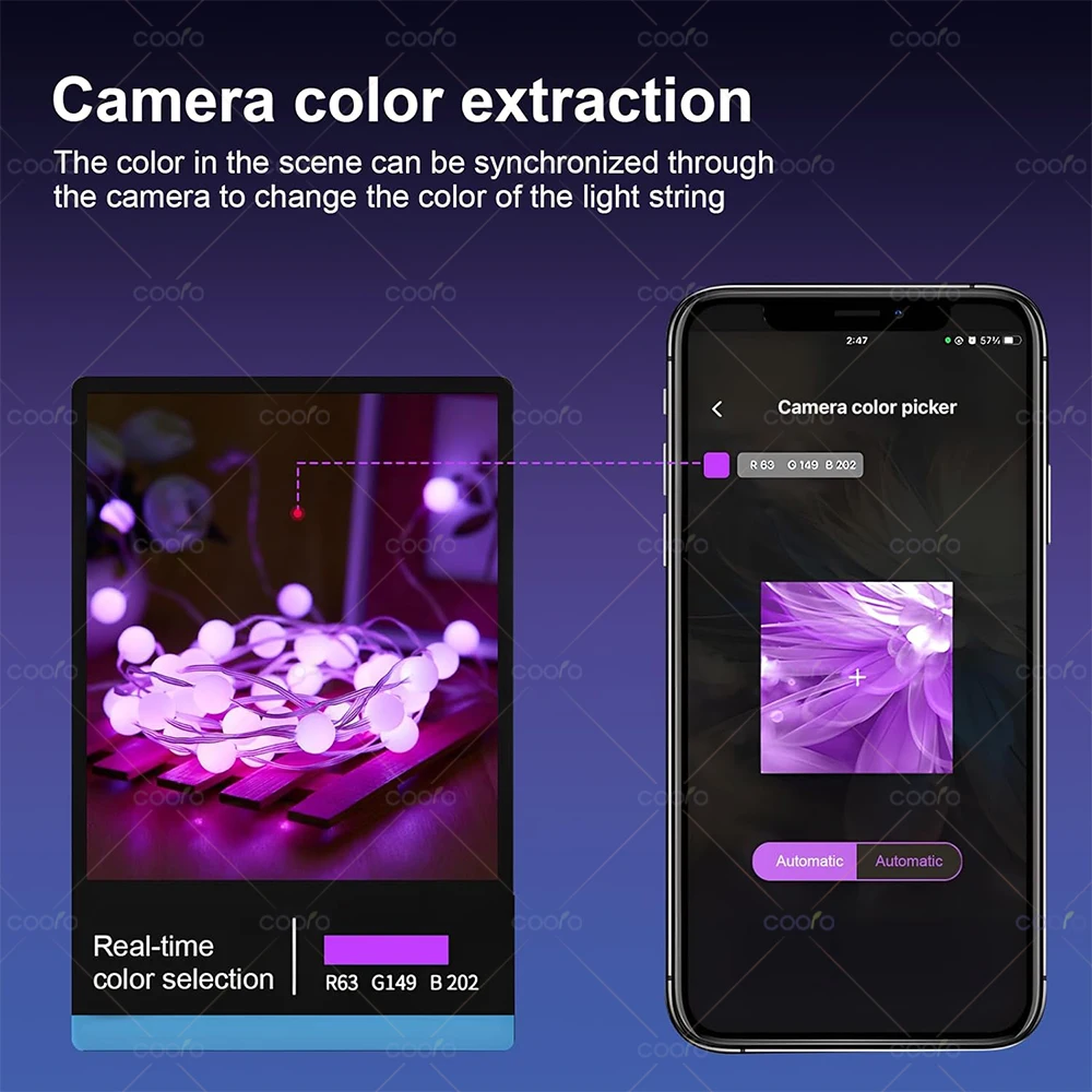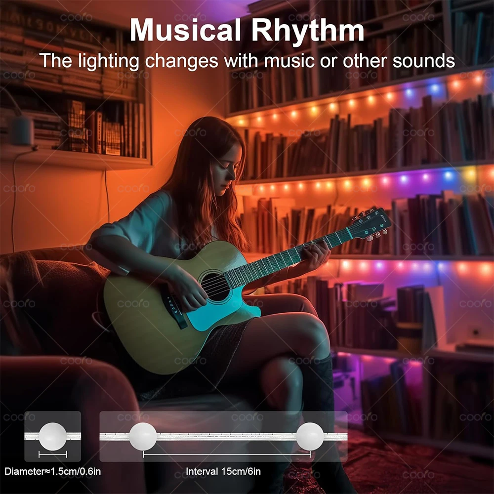 【Explora funciones】Con solo una de ellas, puedes obtener la doble experiencia decorativa de luces de cadena y luces de patio.El sensor de sonido sensible incorporado puede sincronizar el sonido con la luz, especialmente adecuado para reproducir música.Puede configurar el tiempo de iluminación según el estilo de vida diaria de su familia, para poder encenderlo y apagarlo libremente sin ningún problema.También puede tomar el color mediante la cámara del teléfono y sincronizar la pantalla a color en la cadena de luces para configurar.