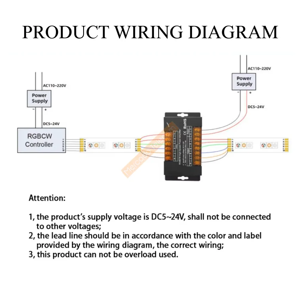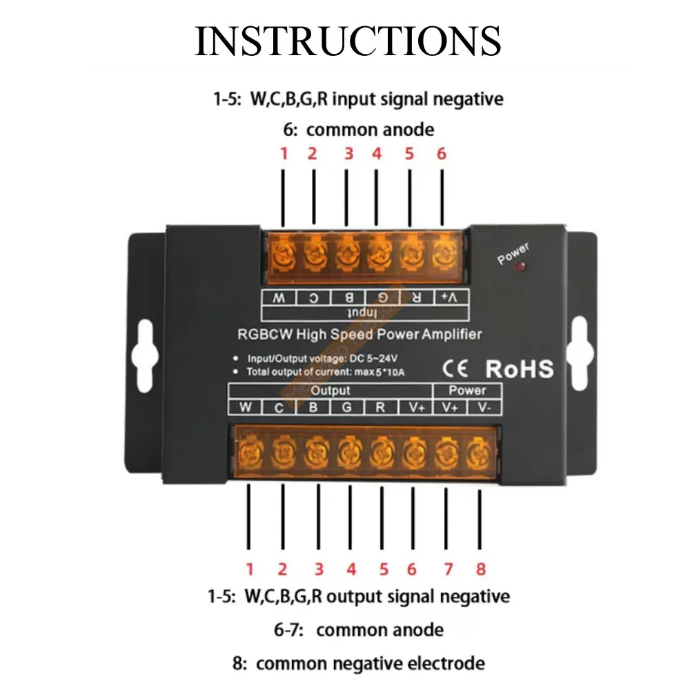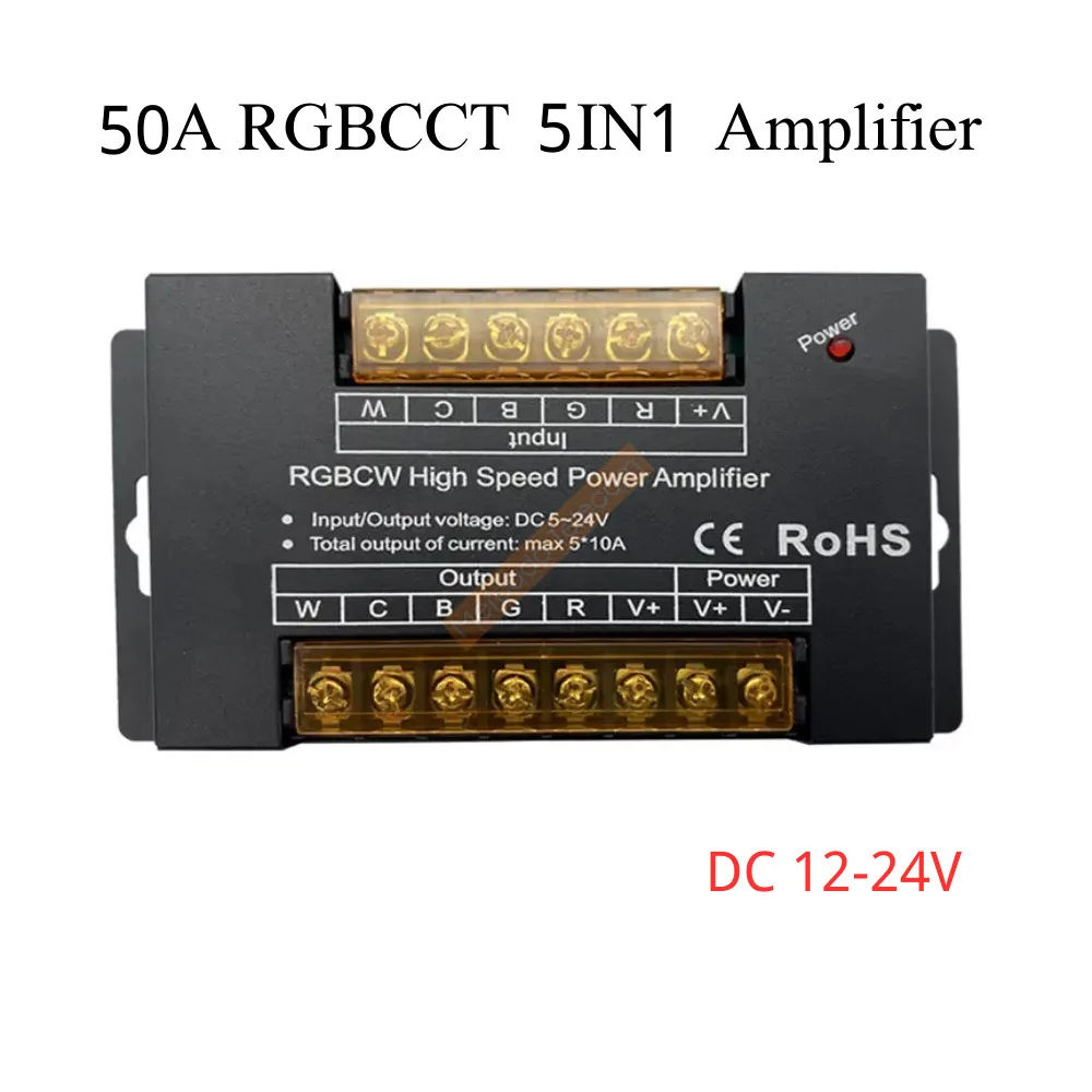 Este amplificador de 5 canales es adecuado para todo tipo de controladores LED dim cct rgbw rgbcct de voltaje constante.