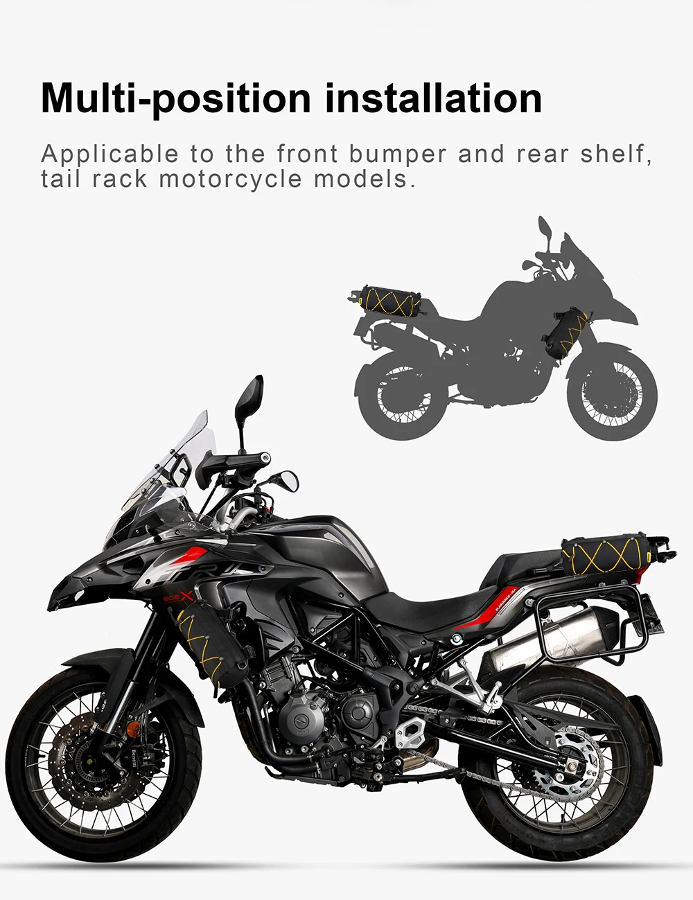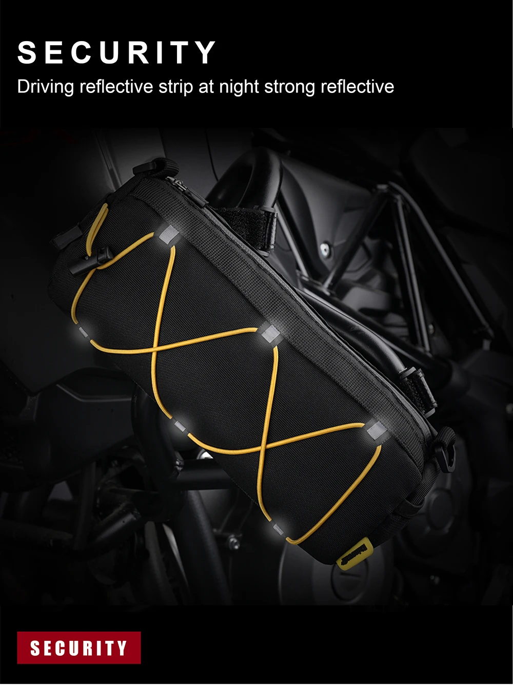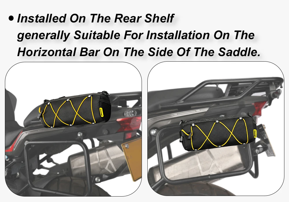 【Gran capacidad】 Tiene una capacidad de aproximadamente 2,4 L, puede almacenar teléfonos móviles, carteras, llaves, herramientas de reparación, guantes, etc. El diseño de la cremallera horizontal superior es conveniente para llevar artículos durante la conducción. La correa elástica frontal puede colgar la ropa mojada.