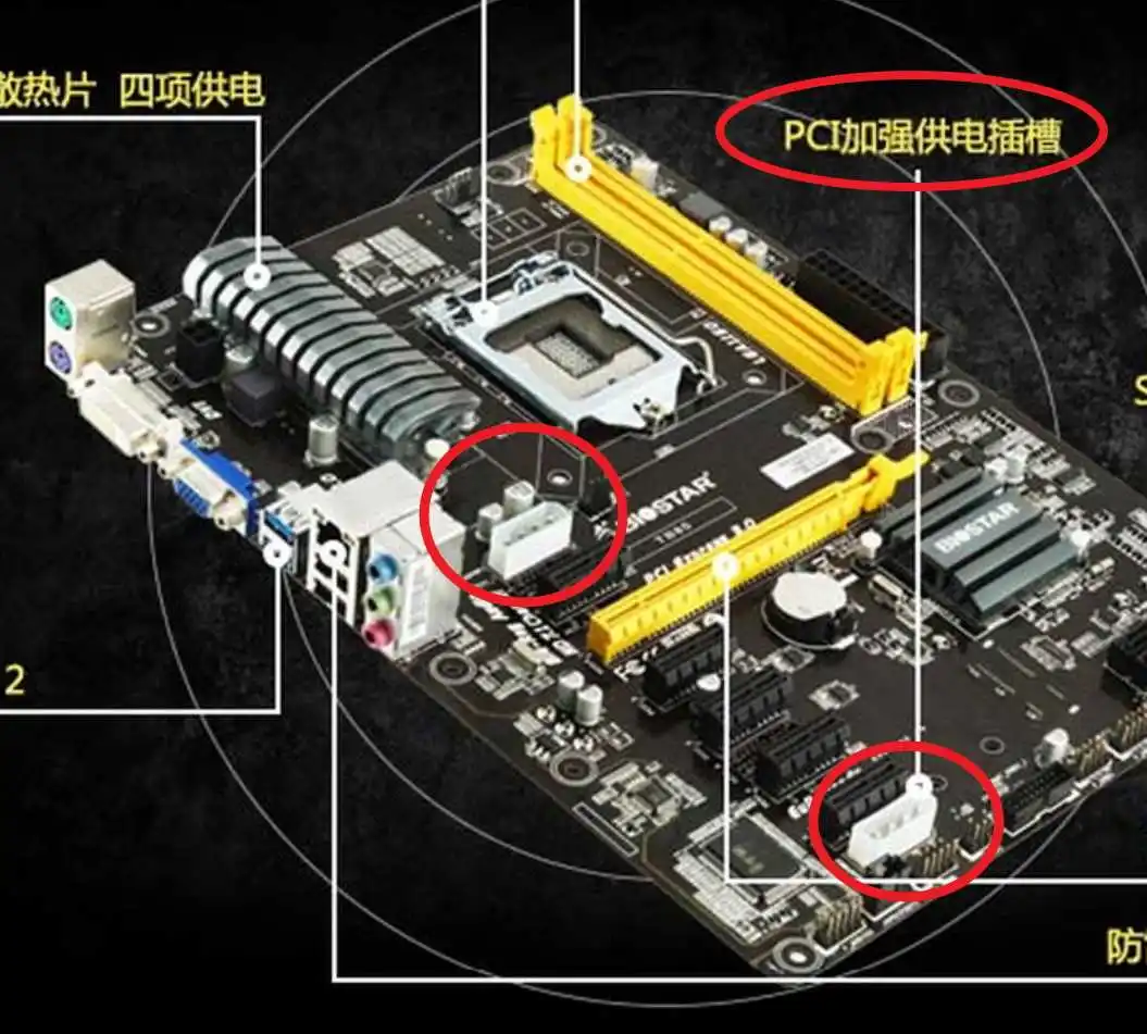 La fuente de alimentación externa del cable de extensión es para resolver el problema de la fuente de alimentación insuficiente de la placa base. Si su placa base tiene 2 puertos de alimentación PCIe mejorados y están conectados de forma segura, no es necesario conectar el cable de extensión a la fuente de alimentación. Conecte el cable de alimentación a la interfaz de fuente de alimentación mejorada de la placa base como se muestra en el círculo rojo: