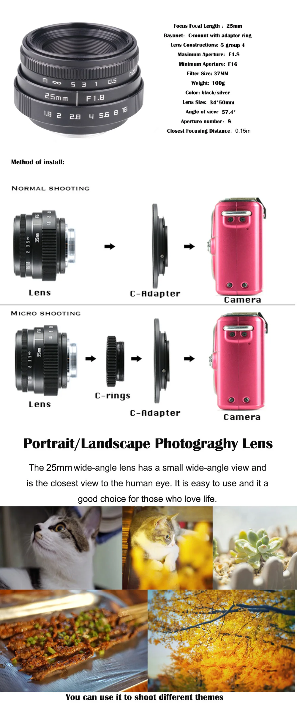 El tamaño compacto y el peso ligero lo convierten en el compañero perfecto para los sistemas de cámaras sin espejo.Los 4 elementos en el diseño óptico de 5 grupos proporcionan una gran nitidez en el centro y en las esquinas, incluso en f/1.8.El círculo de imagen cubre el tamaño del sensor APS-C y es adecuado para cámaras sin espejo con diferentes soportes.