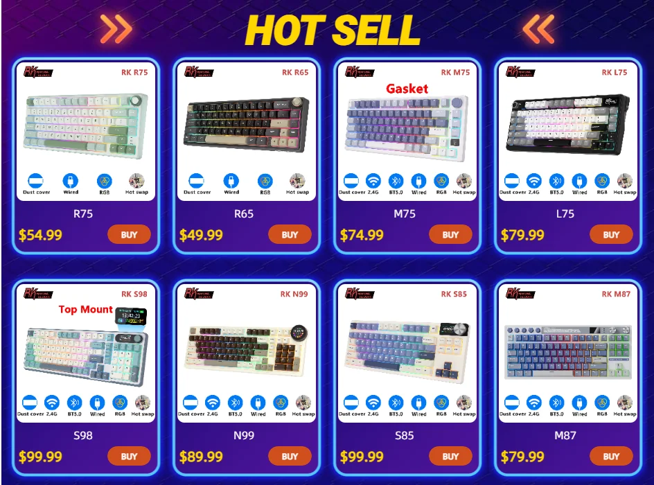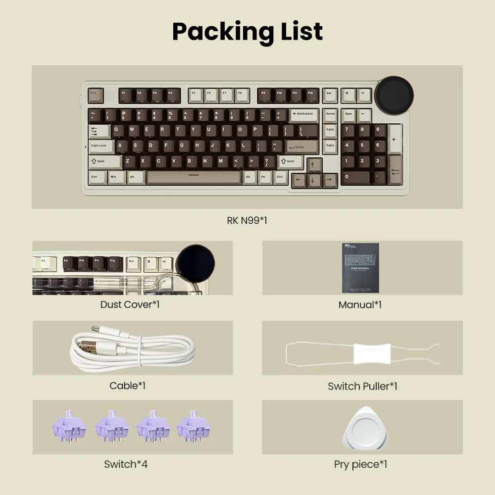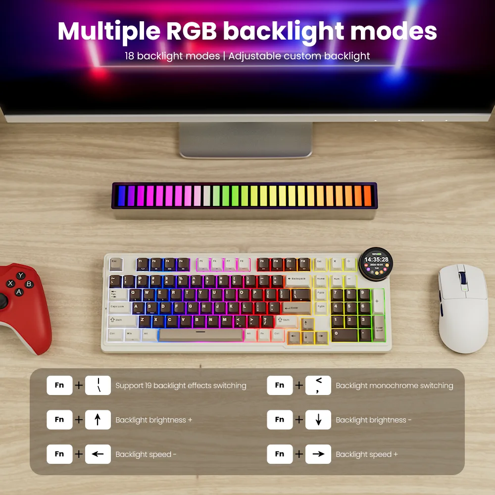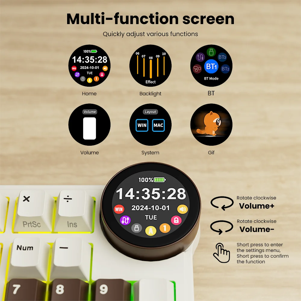 1. El teclado inalámbrico RK N99 de control de perilla intuitivo de pantalla multifunción redefine la versatilidad.La pantalla dinámica muestra GIF personalizadas, fechas, modos de conexión, diseño WIN/MAC y estado de la batería en su pantalla pequeña.Fácil control del volumen.