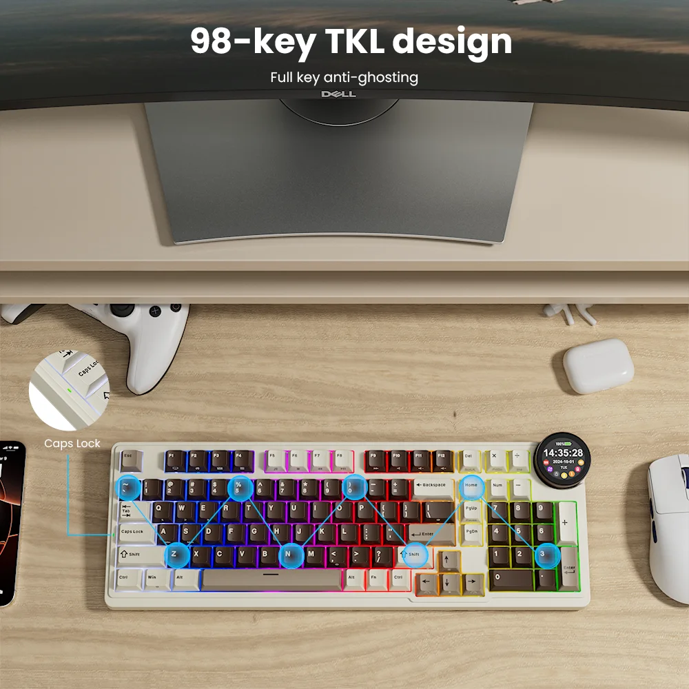 3,98 teclas, 2U número 0: las 98 teclas compactas no tienen conflictos.Con teclas de flecha independientes y teclas numéricas, este teclado mecánico para juegos con diseño del 96% es fantástico para jugadores, mecanógrafos y trabajadores de oficina.