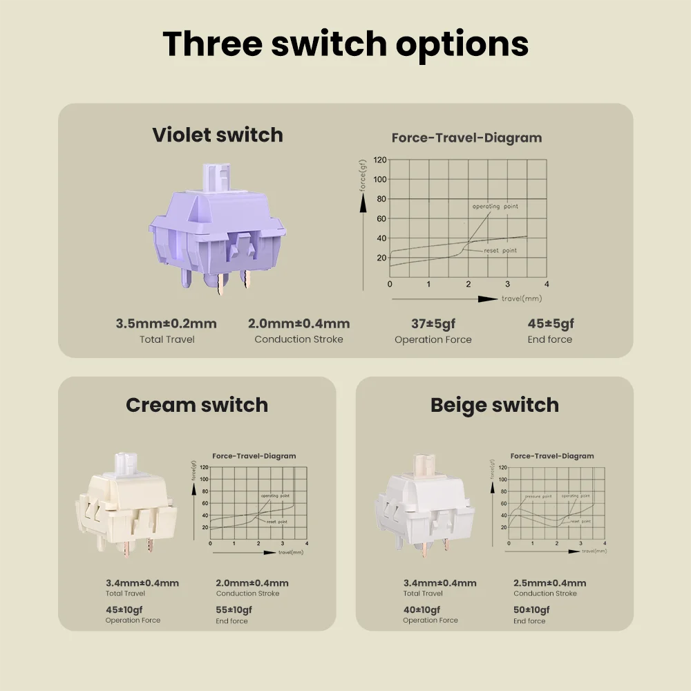Interruptor de crema: interruptor lineal prelubricado personalizado, tiene una apariencia única, un sonido silencioso y una excelente sensación de pulsación de tecla. El resultado es una sensación que más percibe como "más suave" y "más rápido", lo que los hace especialmente populares entre los entusiastas del juego.Cream Switch es el interruptor que mejor se adapta al uso en la oficina.