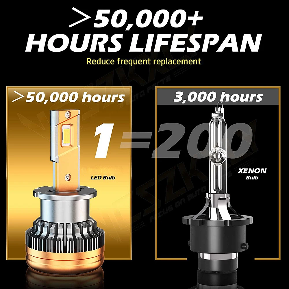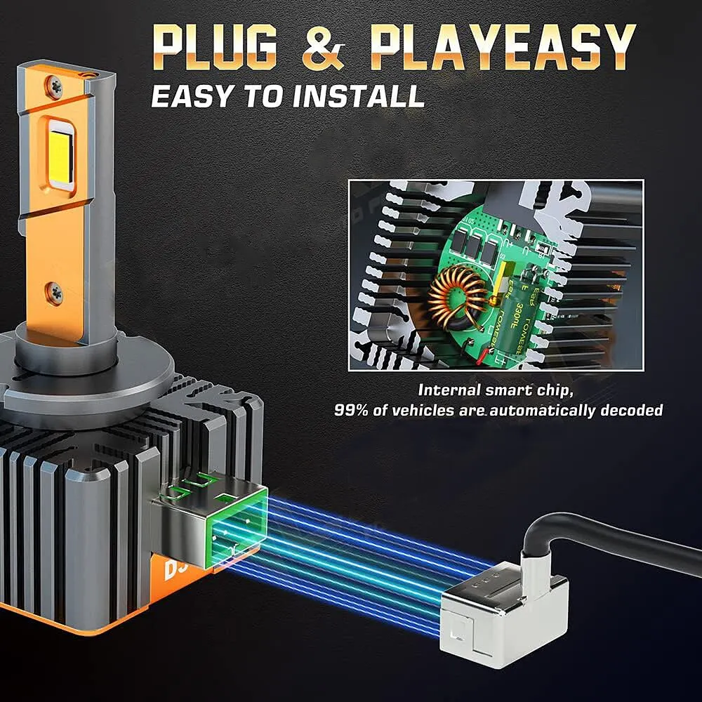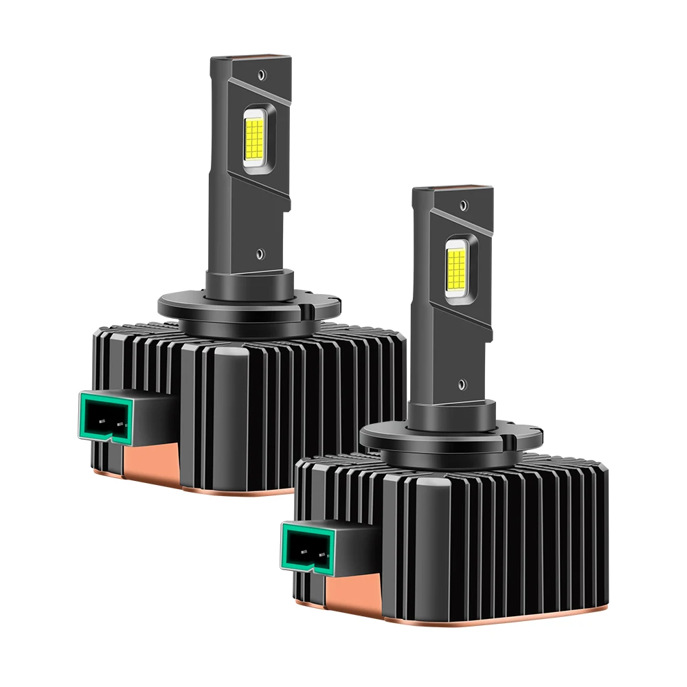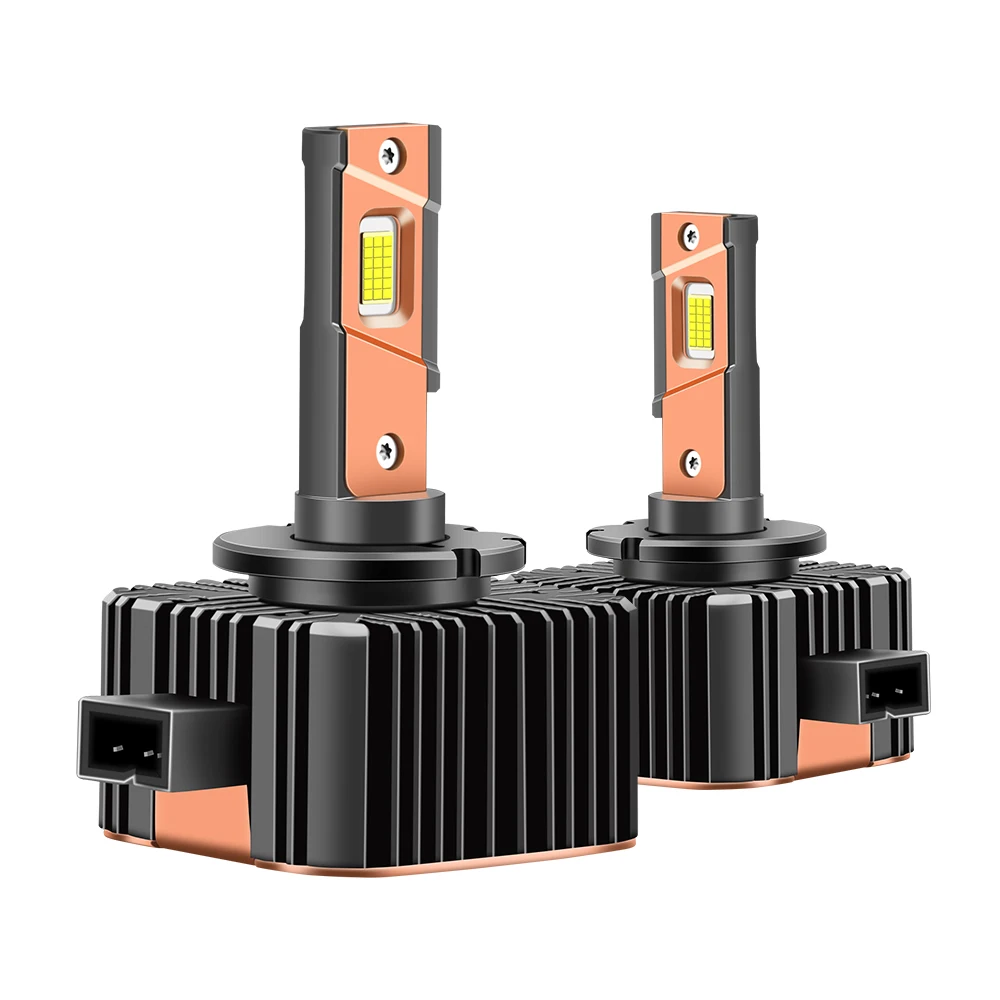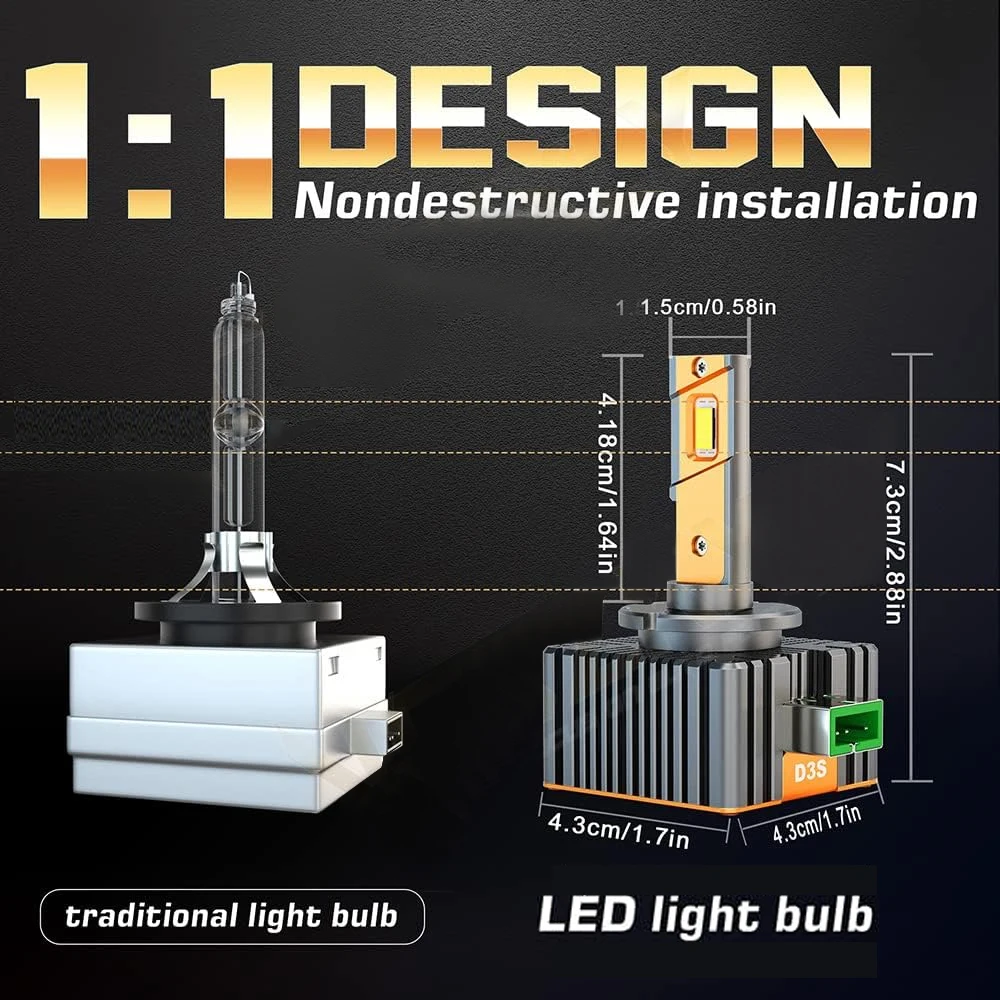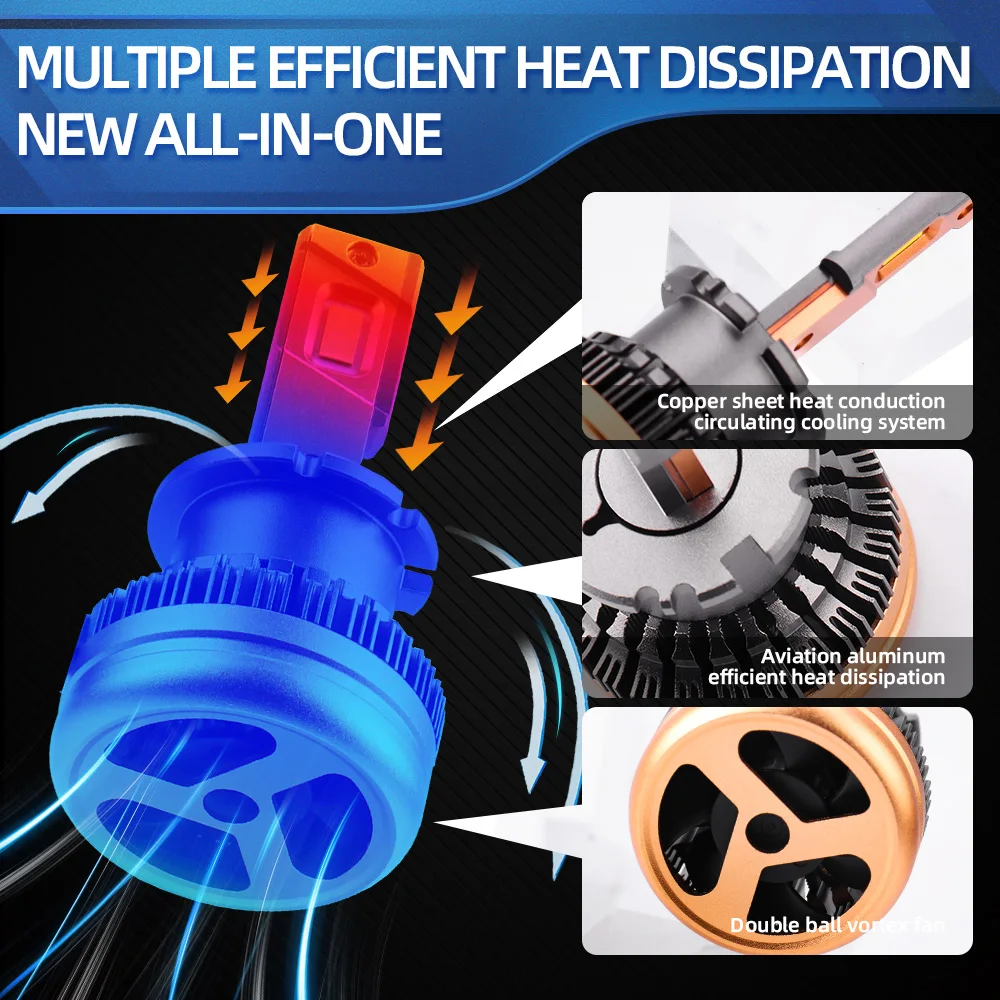 Ventilador de refrigeración IEficientLos bulbos de la linterna de D1S D2S LED adoptan todo el disipador de calor de los finnes de aluminio y la FAN silenciosa de 12.000 RPM Turbo, que la eficacia de la disipación de calor es tan alta como el 50% en esta combinación. ¡Reemplazo perfecto de la bombilla del faro HID! La bombilla D3S D4S D5S puede garantizar una vida útil más larga de más de 50.000 horas.