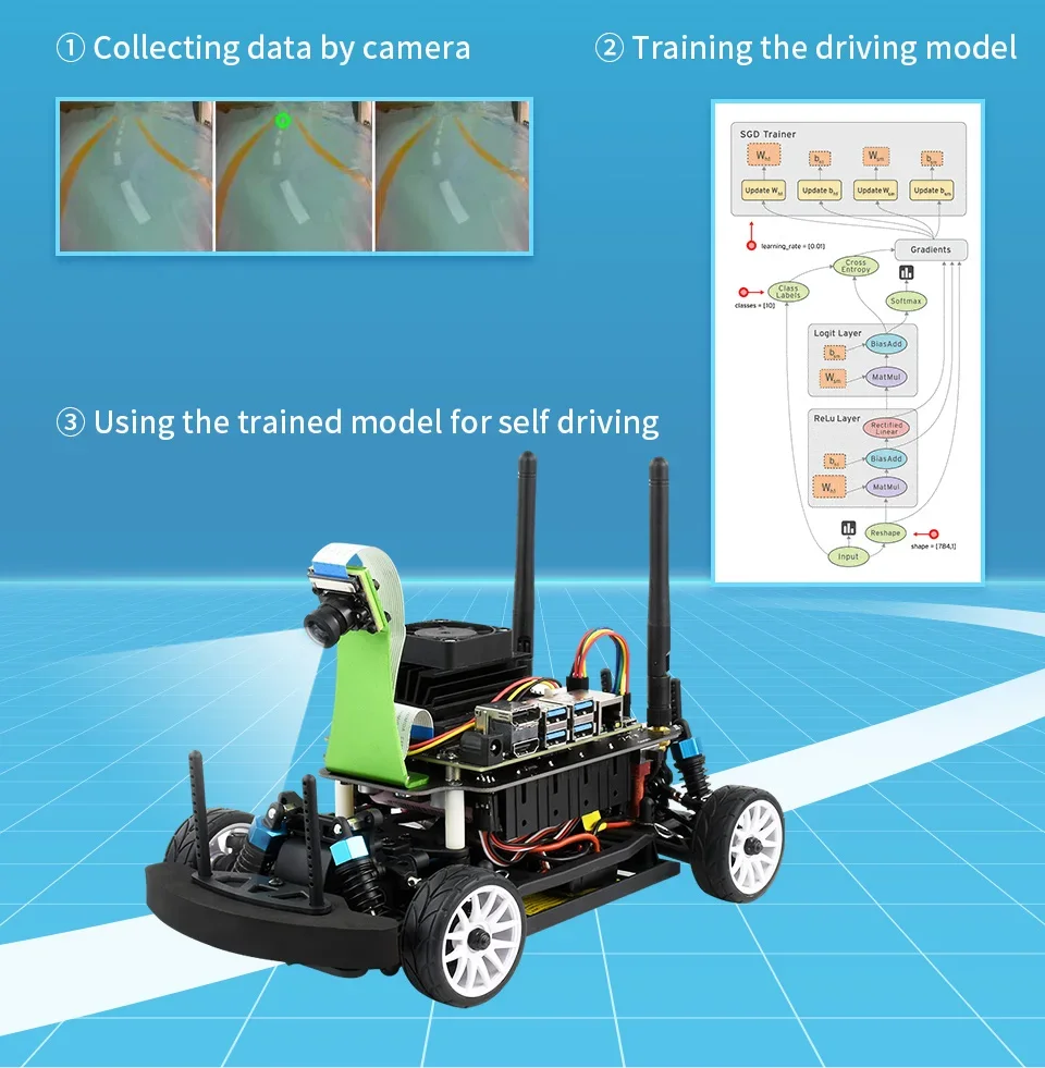 JetRacer Pro también es compatible con el proyecto de código abierto DonkeyCar.DonkeyCar utiliza Framwork de red neuronal de aprendizaje profundo Keras/TensorFlow, junto con la biblioteca de visión por computadora OpenCV, para lograr una conducción autónoma.