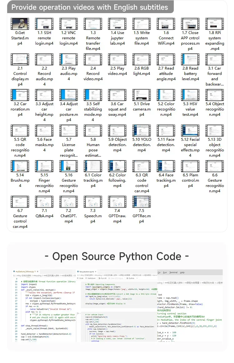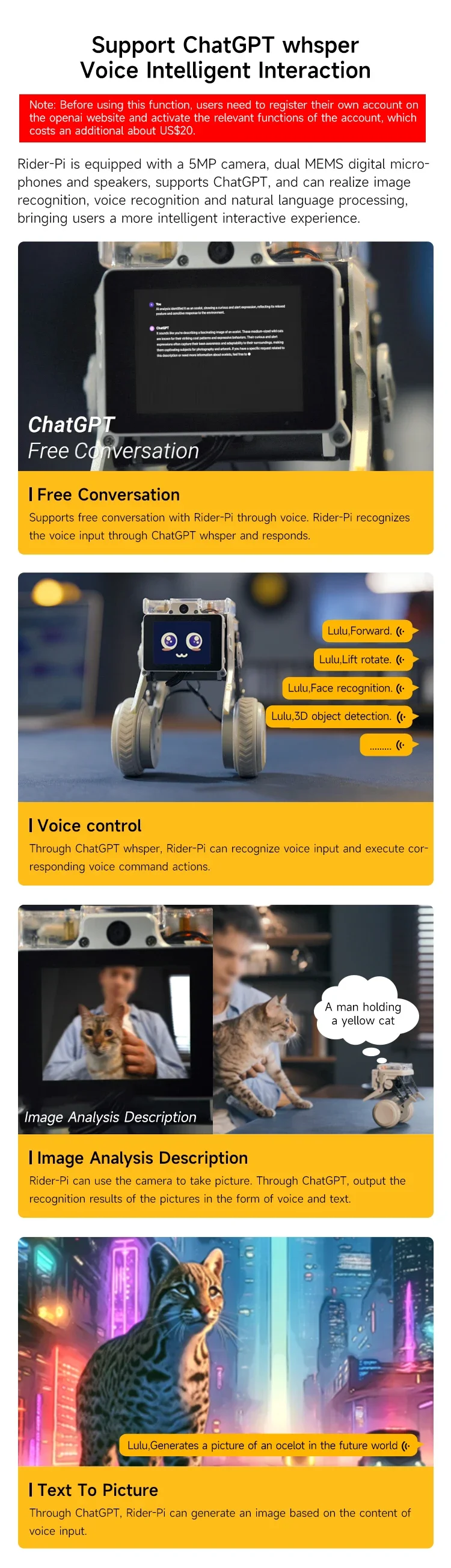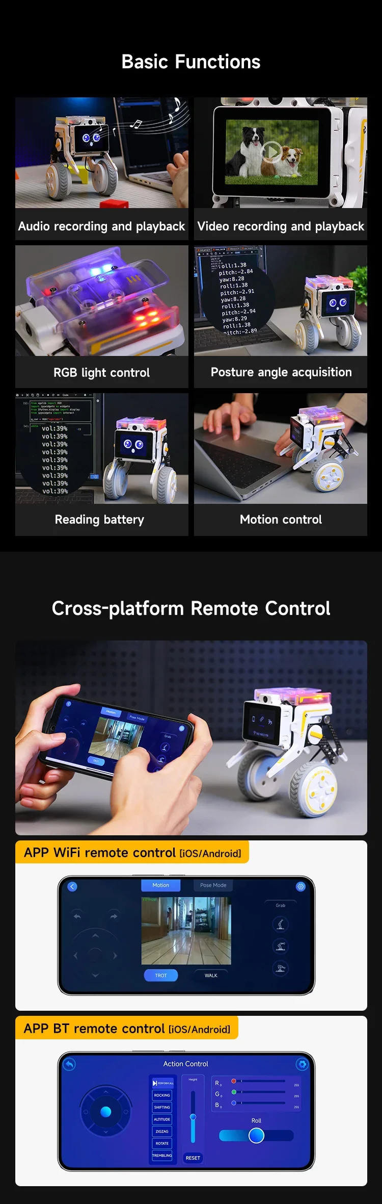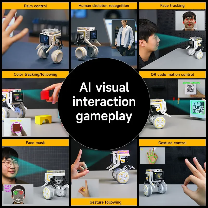 1) Basado en el módulo Raspberry Pi CM4, utiliza programación Python, con mejor rendimiento informático y soporte de desarrollo más amplio. 2) Módulo IMU de alta precisión y estructura de bíceps de biela, tiene la movilidad de los robots con ruedas y la capacidad de cruce de obstáculos de los robots con patas. 3) Equipado con una pantalla IPS de 2,0 pulgadas, puede mostrar de manera flexible 35 expresiones dinámicas. 4) Puede realizar reconocimiento facial, detección de objetos, reconocimiento de gestos, reconocimiento de matrículas, control de códigos QR, etc. 5) Dos métodos de control remoto: la aplicación BT y WiFi (Android/iOS) se proporciona de forma gratuita. 6) Admite ChatGPT (carga adicional), que puede realizar preguntas y respuestas de voz, control de voz, texto a imagen, descripción de análisis de imágenes, etc.