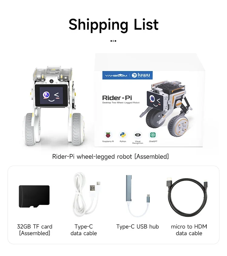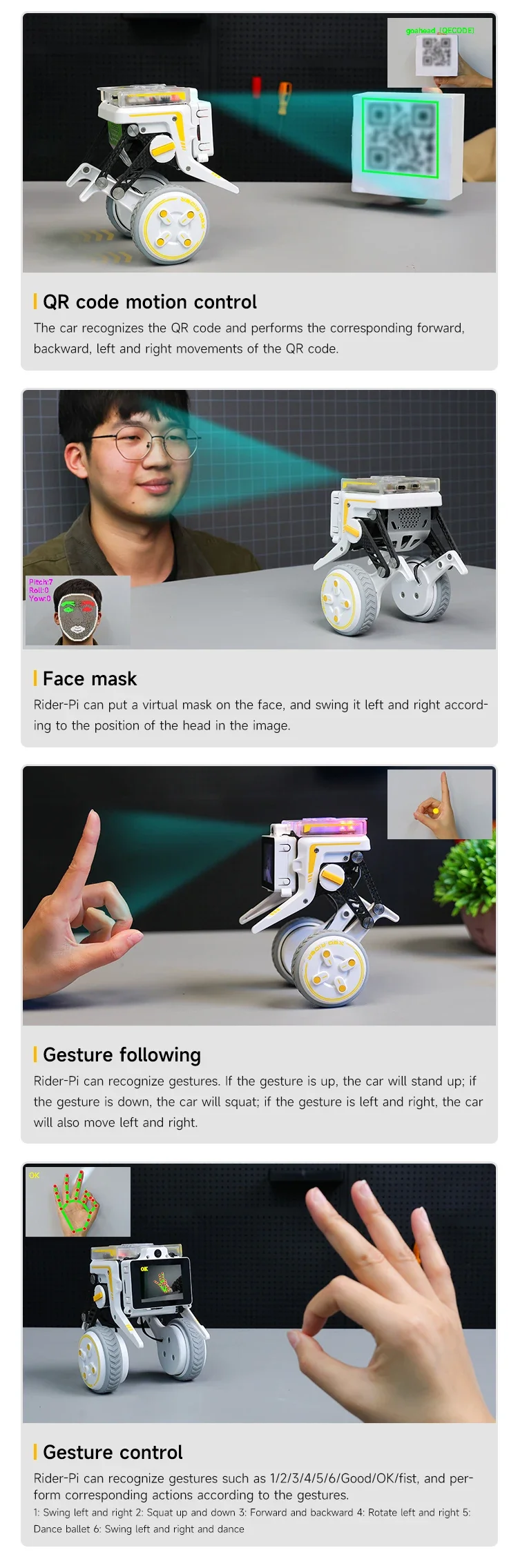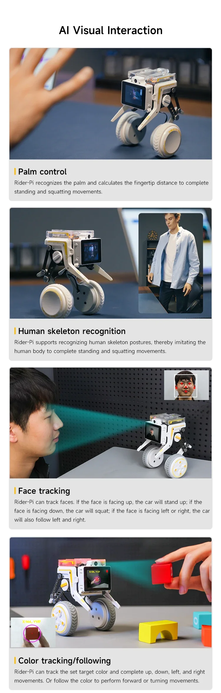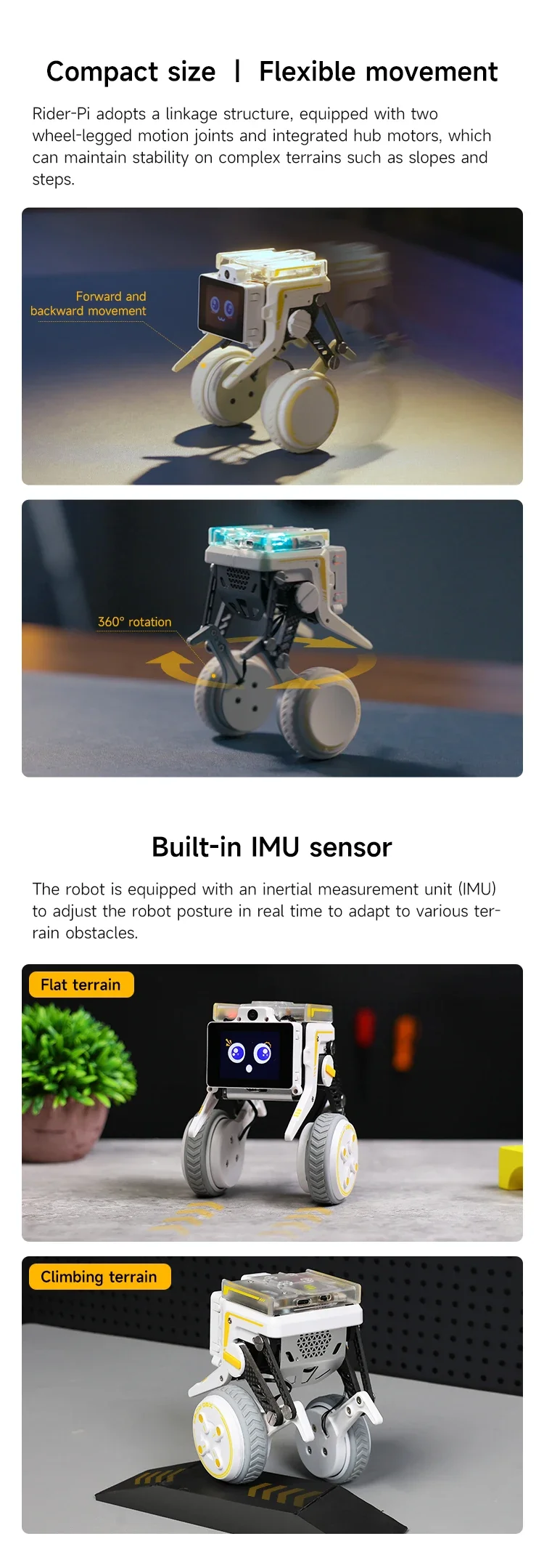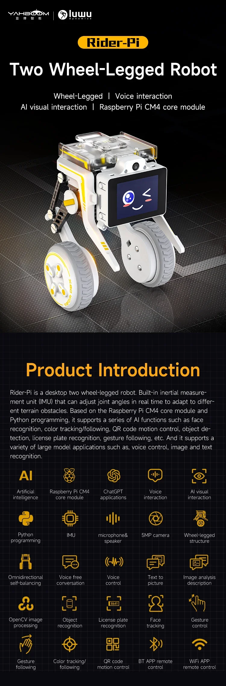 Rider-Pi es un robot de escritorio de dos patas con ruedas diseñado para desarrolladores, educadores y entusiastas de los robots.Unidad de medida inercial (IMU) incorporada y estructura de biela de fibra de carbono, que permiten al robot ajustar el ángulo de la articulación en tiempo real para adaptarse a diferentes obstáculos del terreno.Basado en el módulo central Raspberry Pi CM4, adopte la programación Python, admita una serie de funciones AI como reconocimiento facial, seguimiento/seguimiento de color, control de movimiento de código QR, detección de objetos, reconocimiento de matrículas, seguimiento de gestos, etc.Una pantalla IPS de 2,0 pulgadas en el frente puede mostrar imágenes de vídeo y 35 expresiones dinámicas en tiempo real.Además, Rider-Pi también admite ChatGPT (carga adicional), que puede realizar funciones de preguntas y respuestas de voz, control de voz, texto a imagen y descripción de análisis de imágenes.