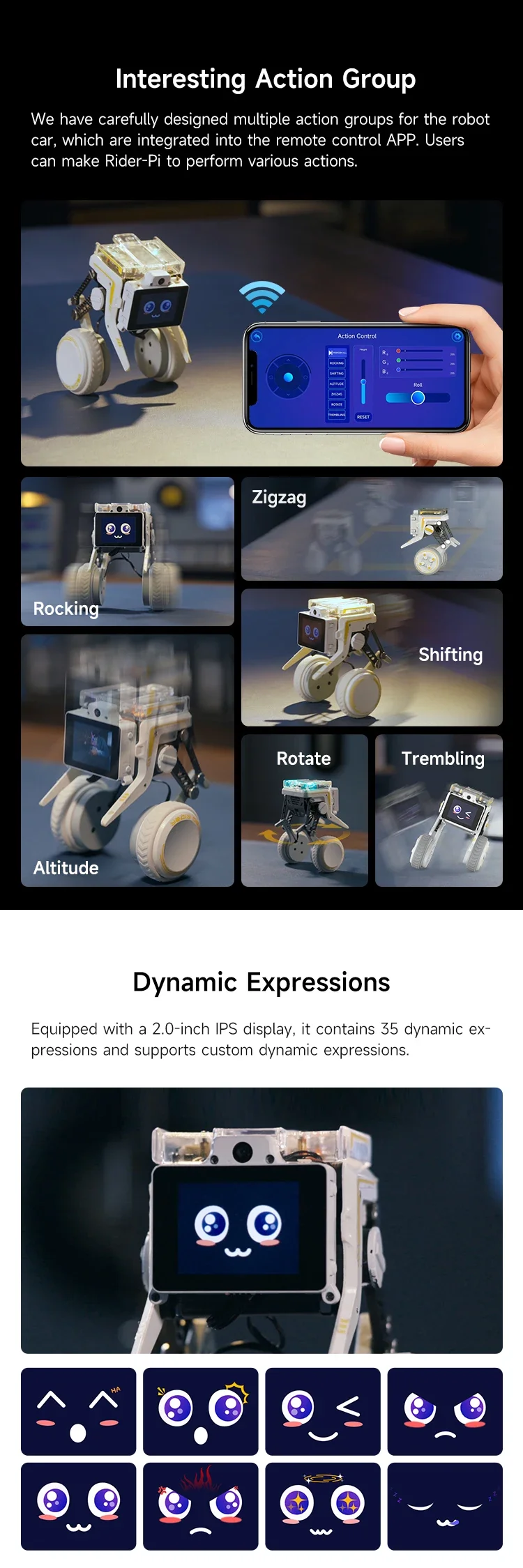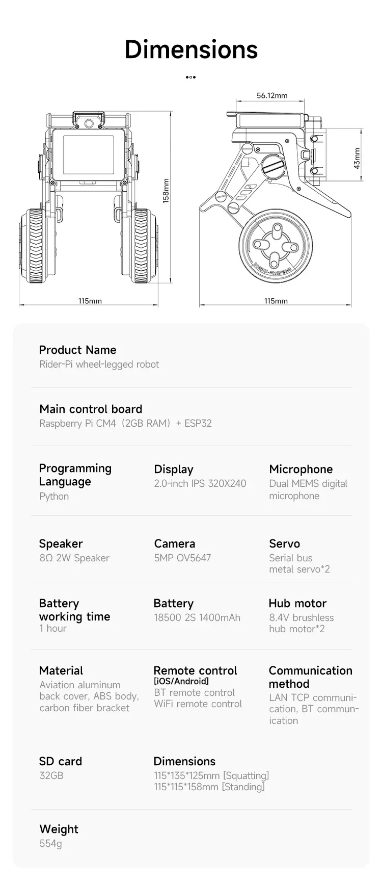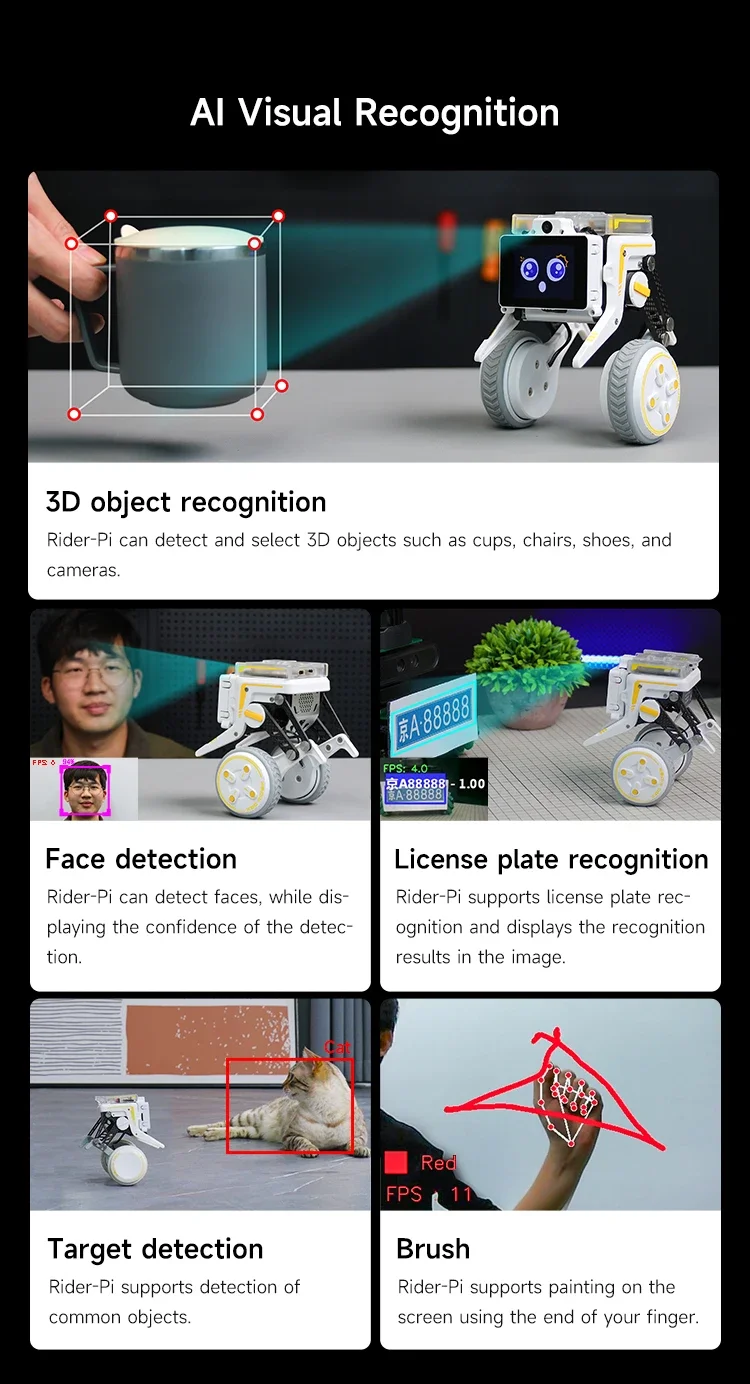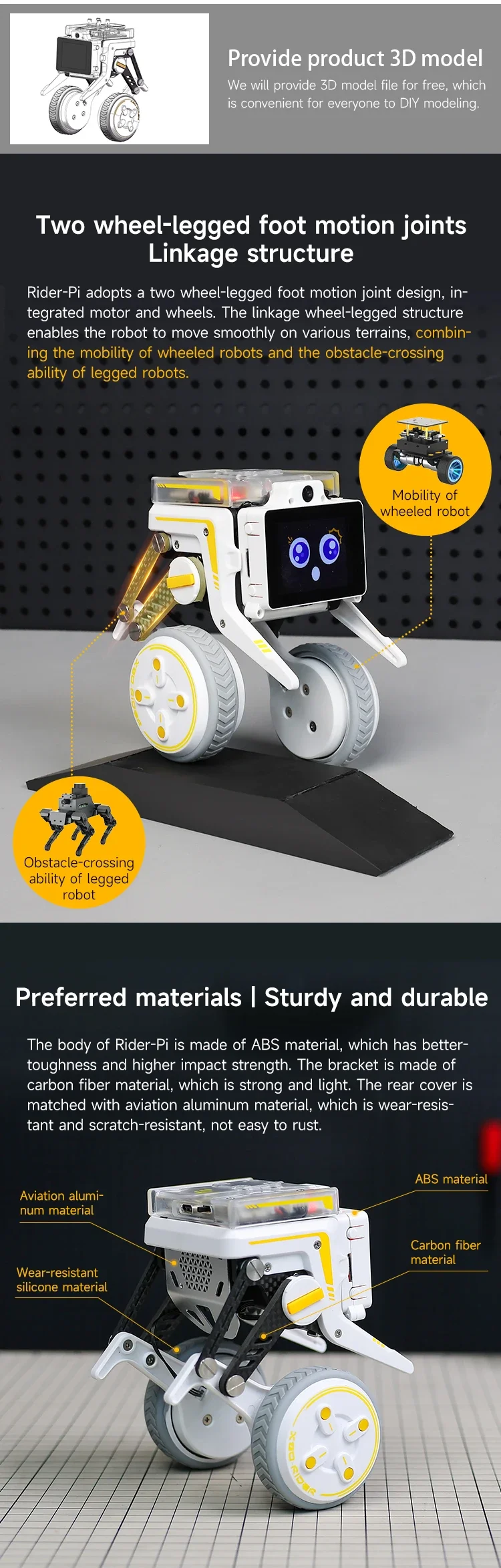 Rider-Pi es un robot de escritorio de dos patas con ruedas diseñado para desarrolladores, educadores y entusiastas de los robots.Unidad de medida inercial (IMU) incorporada y estructura de biela de fibra de carbono, que permiten al robot ajustar el ángulo de la articulación en tiempo real para adaptarse a diferentes obstáculos del terreno.Basado en el módulo central Raspberry Pi CM4, adopte la programación Python, admita una serie de funciones AI como reconocimiento facial, seguimiento/seguimiento de color, control de movimiento de código QR, detección de objetos, reconocimiento de matrículas, seguimiento de gestos, etc.Una pantalla IPS de 2,0 pulgadas en el frente puede mostrar imágenes de vídeo y 35 expresiones dinámicas en tiempo real.Además, Rider-Pi también admite ChatGPT (carga adicional), que puede realizar funciones de preguntas y respuestas de voz, control de voz, texto a imagen y descripción de análisis de imágenes.