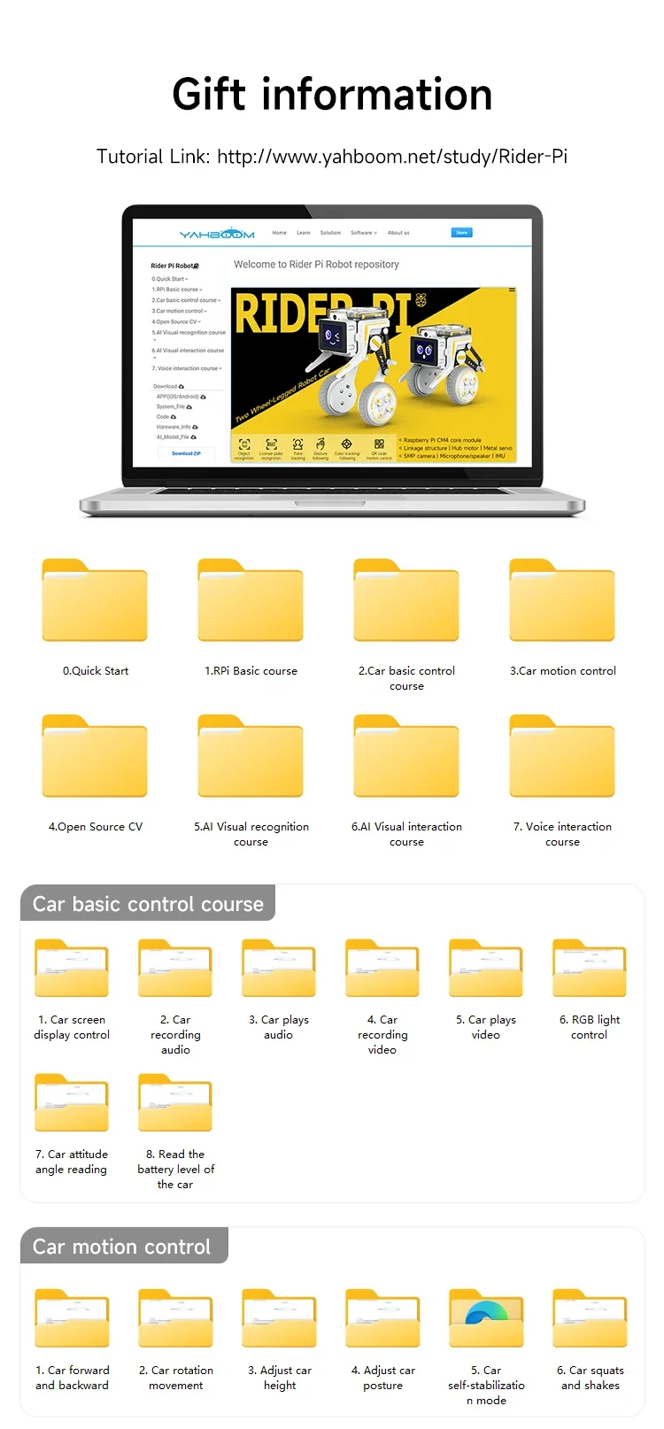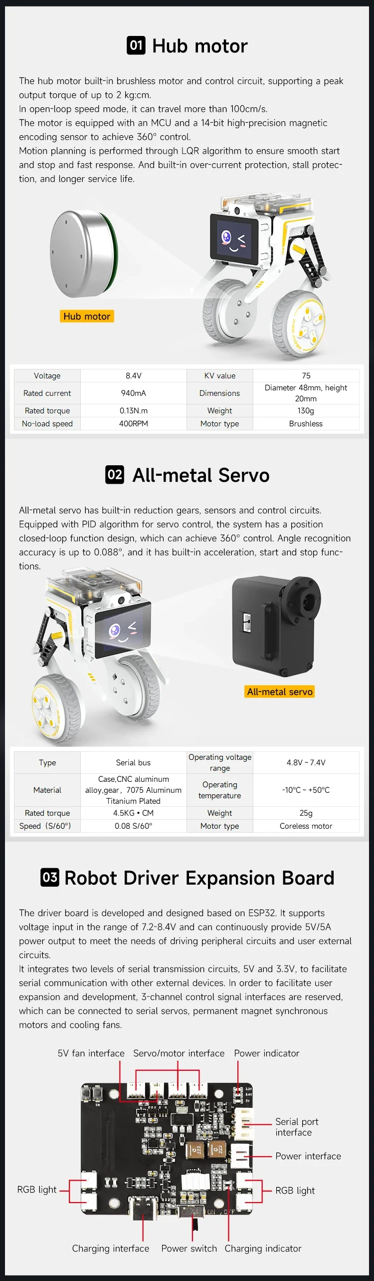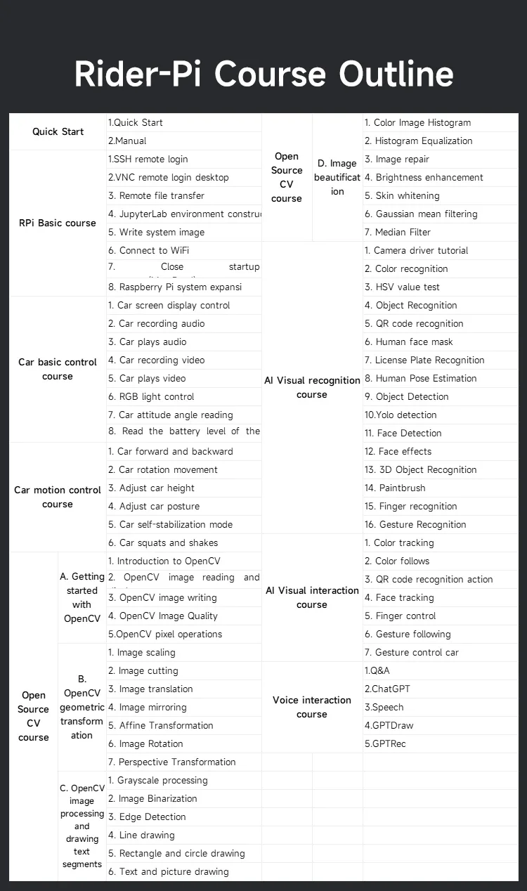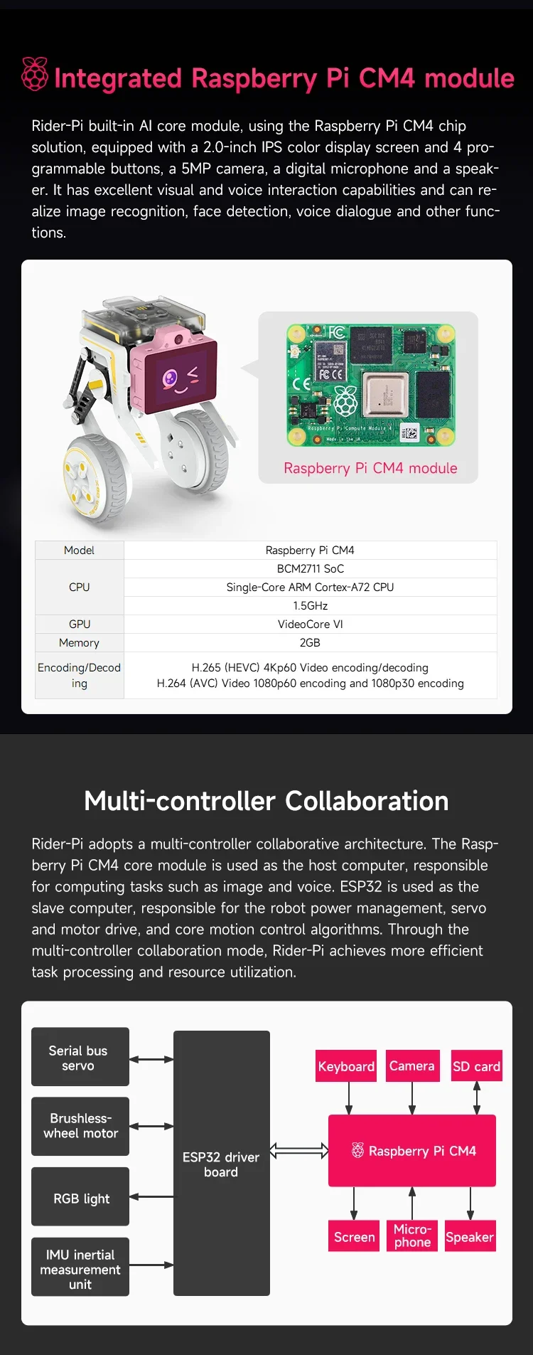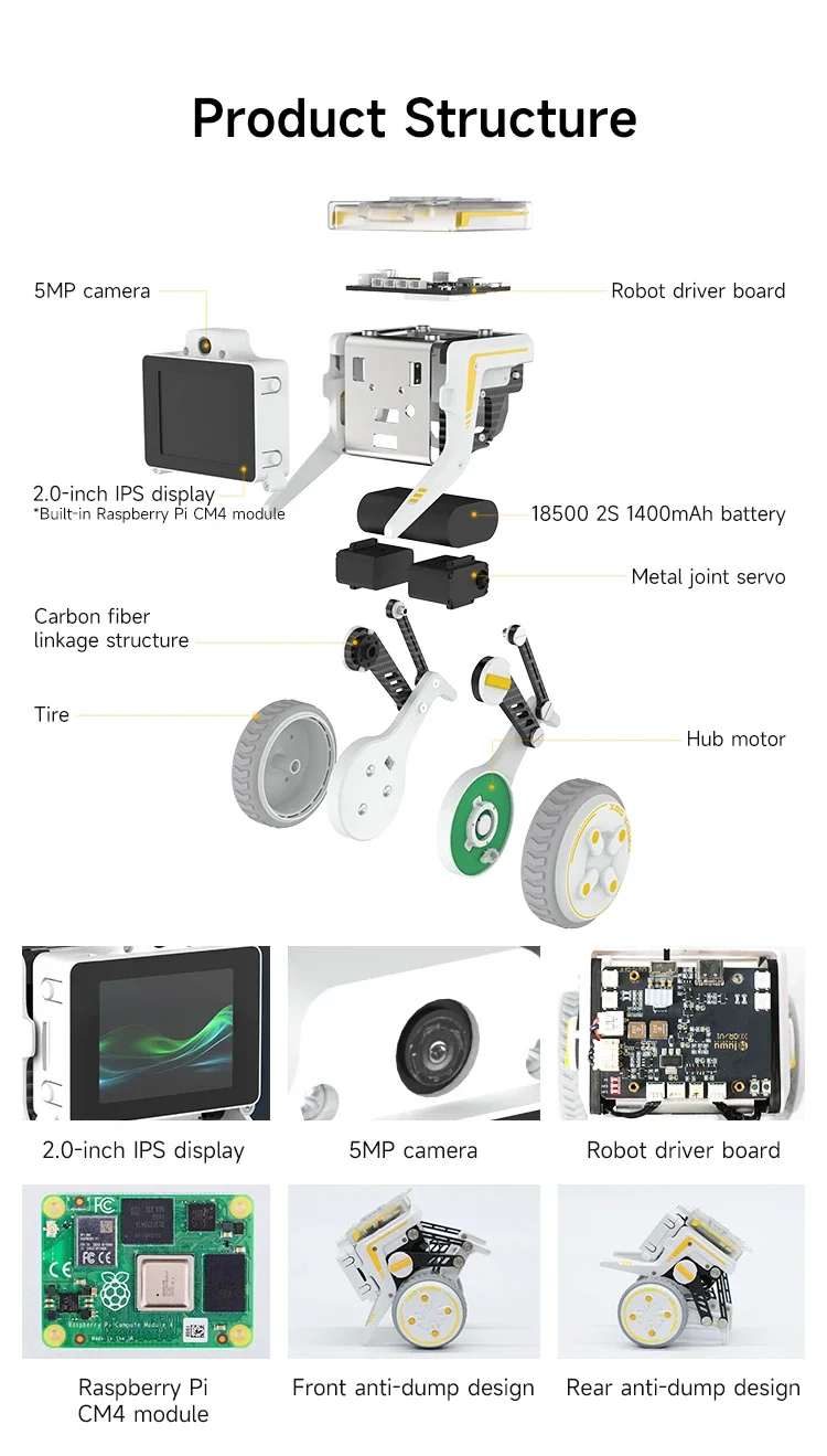 Rider-Pi es un robot de escritorio de dos patas con ruedas diseñado para desarrolladores, educadores y entusiastas de los robots.Unidad de medida inercial (IMU) incorporada y estructura de biela de fibra de carbono, que permiten al robot ajustar el ángulo de la articulación en tiempo real para adaptarse a diferentes obstáculos del terreno.Basado en el módulo central Raspberry Pi CM4, adopte la programación Python, admita una serie de funciones AI como reconocimiento facial, seguimiento/seguimiento de color, control de movimiento de código QR, detección de objetos, reconocimiento de matrículas, seguimiento de gestos, etc.Una pantalla IPS de 2,0 pulgadas en el frente puede mostrar imágenes de vídeo y 35 expresiones dinámicas en tiempo real.Además, Rider-Pi también admite ChatGPT (carga adicional), que puede realizar funciones de preguntas y respuestas de voz, control de voz, texto a imagen y descripción de análisis de imágenes.