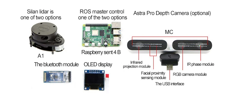 Drive structure:Three-wheel omnidirectional construction The wheel:60mm Metal omnidirectional wheel The steering gear:NO Size: 240"240*183 The car weight:2.18kg Load capacity:3kg Maximum speed:0.84m/s Light load range(Speed 0.45m/s):5h The load lasts for 1kg(Speed 0.45m/s):3h The motor:MG513 motor The encoder:AB phase high-precision photoelectric encoder with 500 wire The control mode:APP, PS2 wireless gamepad, CAN, sernial port, etc STM32 master:STM32F103VET6 Laser radar:Silane A1 standard version ROS master:Raspberry Pi 4B (2G+32G) Depth camera: ASRTA Pro RGBD Depth Camera The operating system:STM32 is equipped with Freertos ROS and Ubuntu 18.04+ Melodic data:Full series of development manuals, video tutorials ROS source code, STM32 source code, ROS mirror