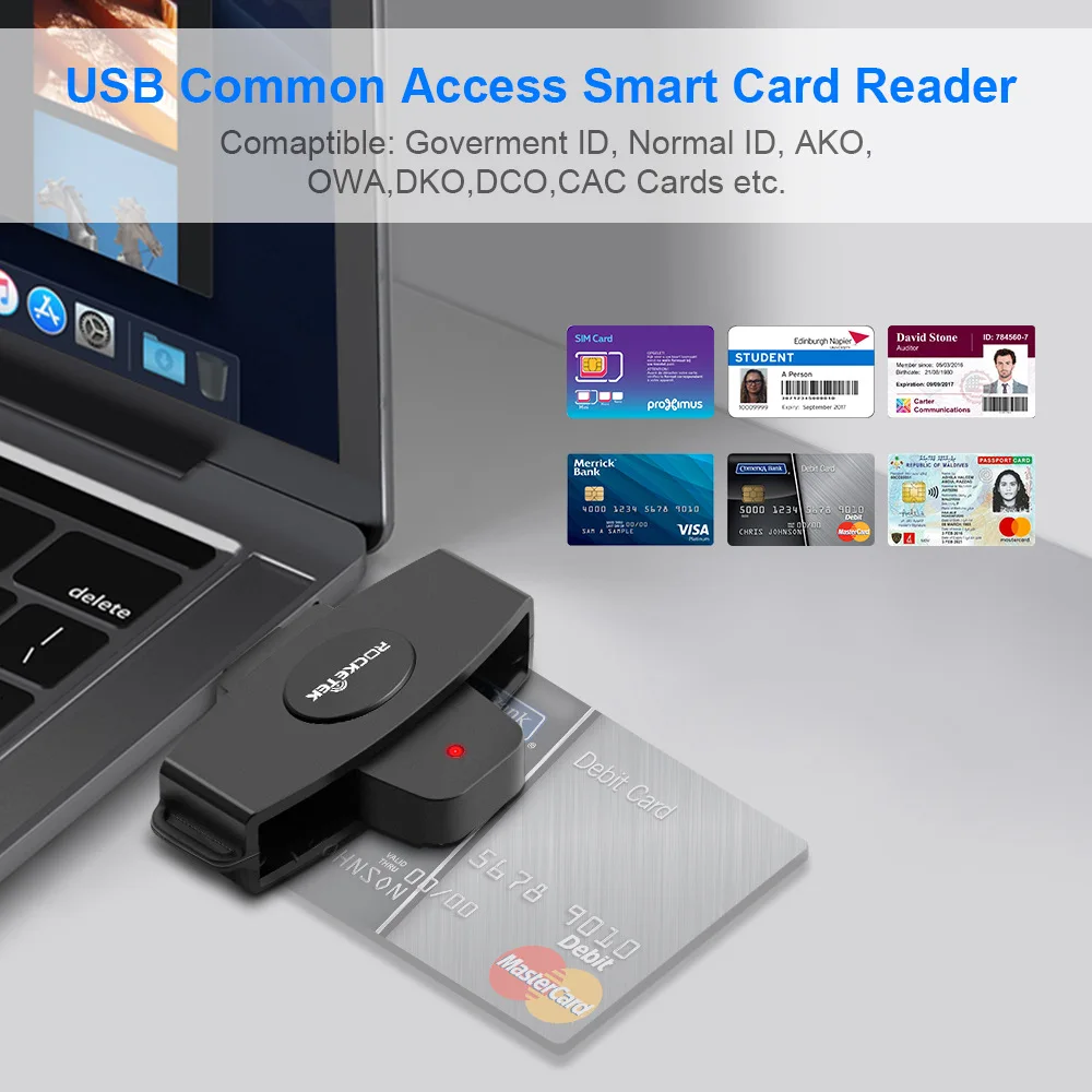 El lector de tarjetas inteligentes multifunción USB C de Rocketek es un dispositivo USB fácil de instalar que es compatible con casi todas las tarjetas inteligentes de contacto, sistemas operativos, y varias aplicaciones, incluyendo Banca en línea y firmas digitales. Para ordenadores tipo C, esto es fácil de instalar y operar.