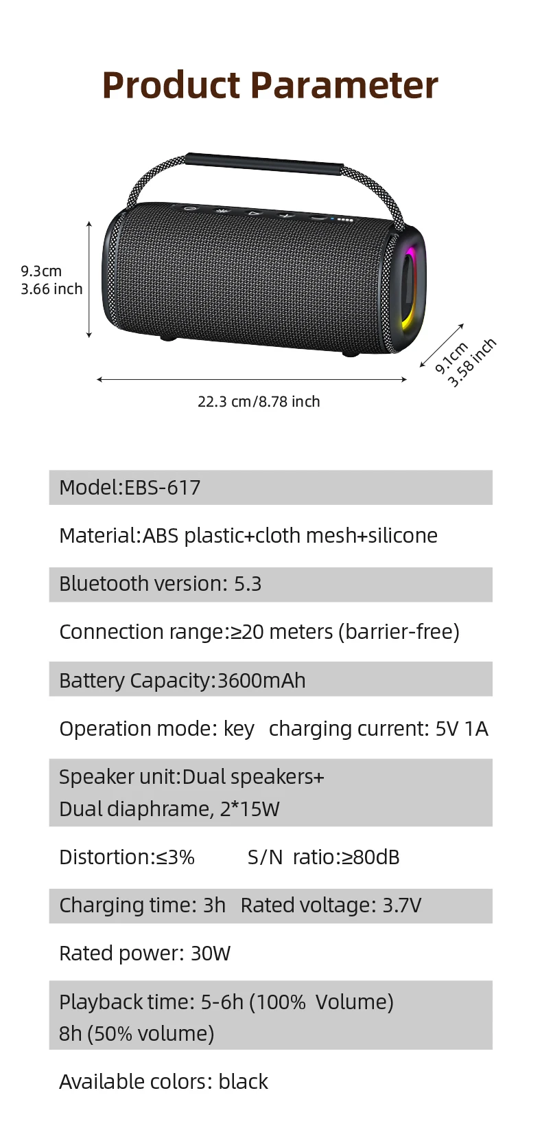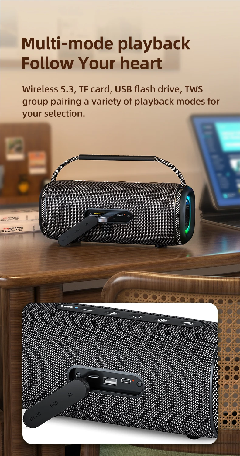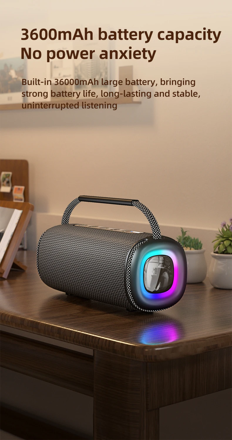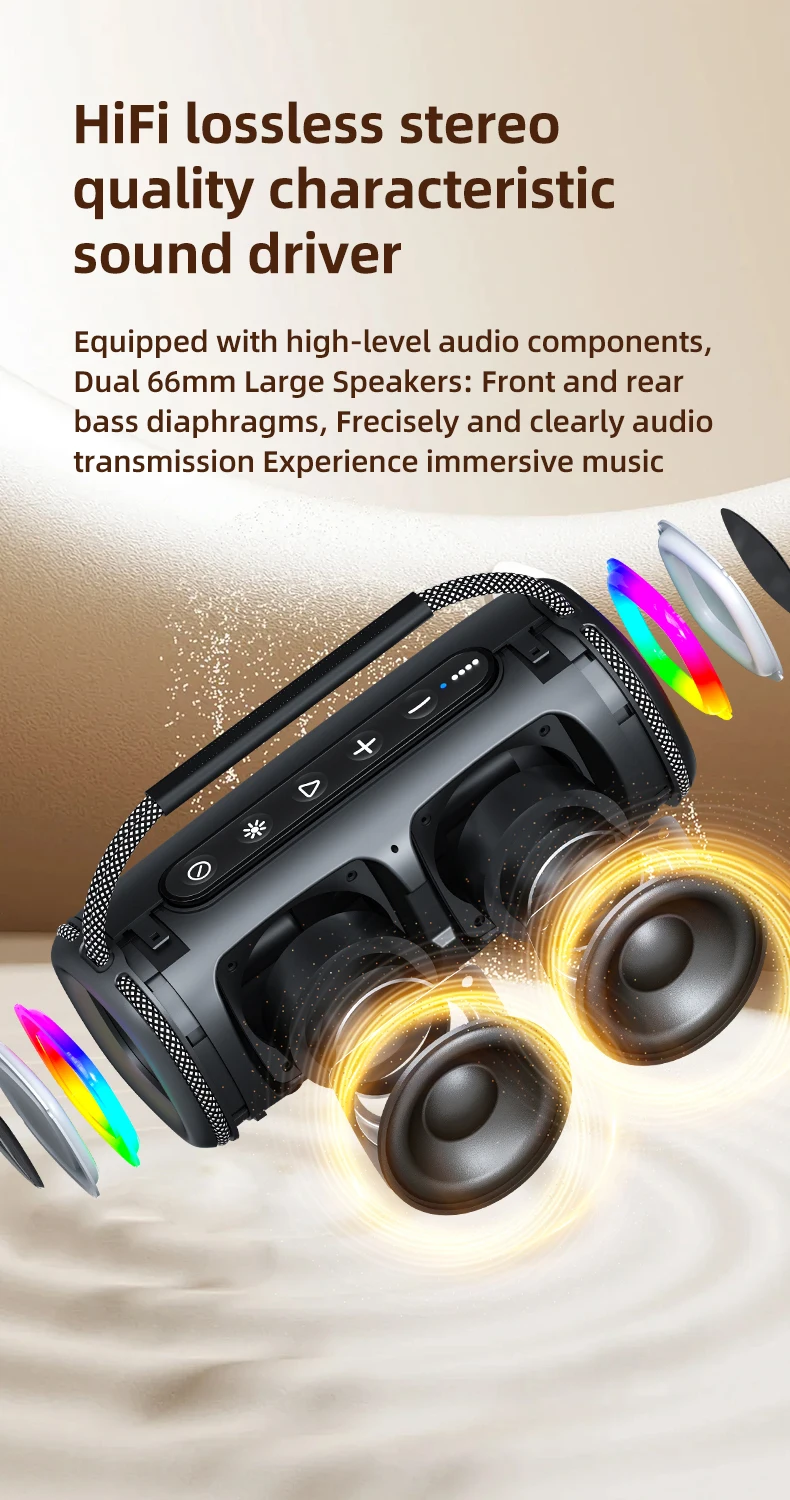 Equipado con una potencia de 20 W, este altavoz ofrece un sonido nítido, mientras que sus luces RGB añaden una experiencia visual vibrante.