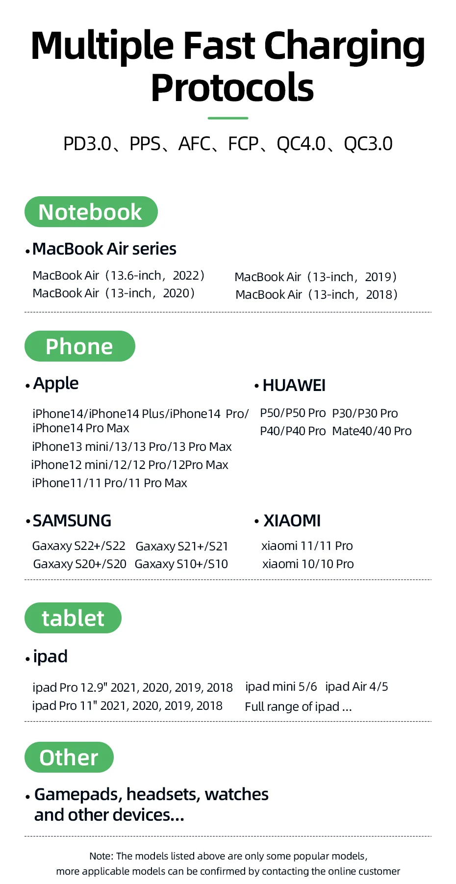 • Carga rápida :Carga múltiples dispositivos rápidamente con una potencia de salida máxima de 100W.