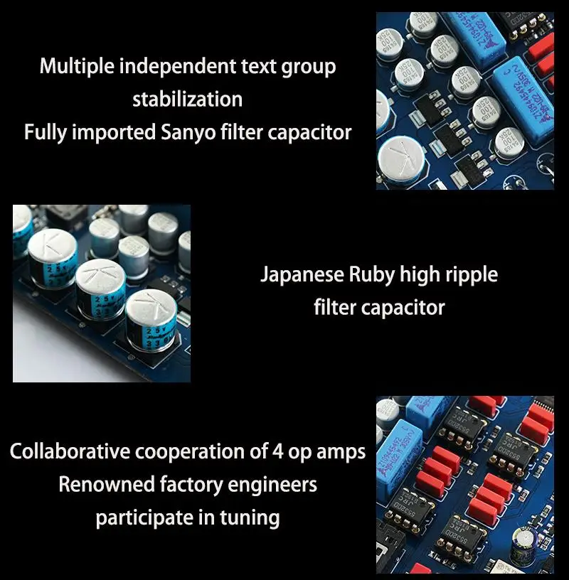 2.Después de un cuidadoso composición y diseño, la placa de circuito está equipada con cuatro amplificadores operacionales duales reemplazables, condensadores de filtro de alta ondulación Ruby japoneses, condensadores de filtro Sanyo totalmente importados, relés Omron originales y otros componentes profesionales, que tienen una relación costo-rendimiento muy alta.