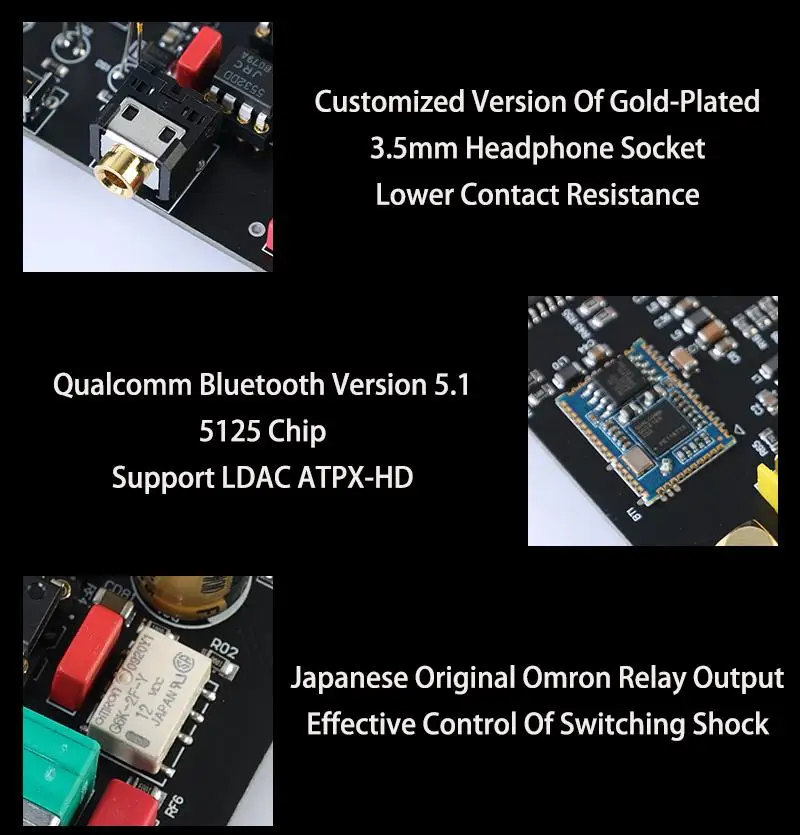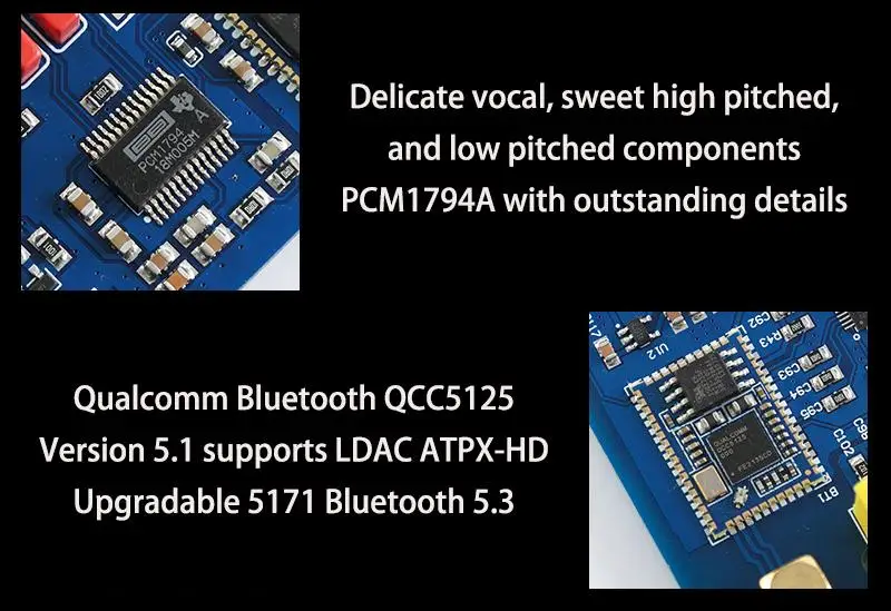 1.UsandoPCM1794AChip decodificador, la calidad del sonido mejora perfectamente y lo últimoQCC3084Chip Bluetooth, la reproducción del teléfono móvil también puede lograr un buen sonido.
