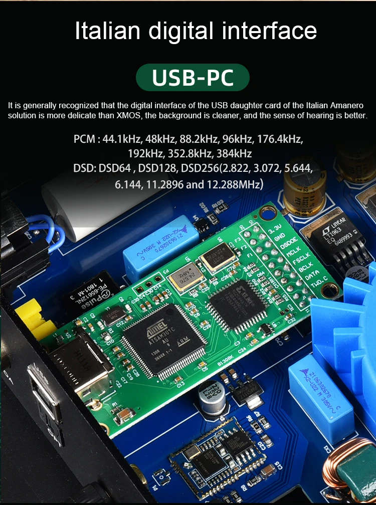 -USB Amanero: PCM 16-32bit, 44,1 K,48K, 88,2 k,96k, 176,4 k,192k, 352,8 k,384k,DSD64 (2,8 M),DSD128 (5,6 M),DSD256 (11,28 M),DSD512 (22,57 M)