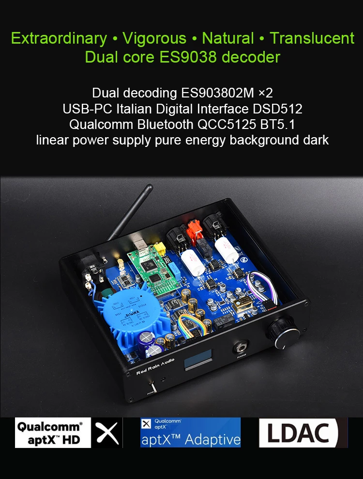 Rod Rain Audio DA10 Decodificador de audio Amplificador de auriculares Bluetooth Dual ES9038Q2M DAC QCC5125 LDAC Amanero Tarjeta USB DSD512 TPA612A2