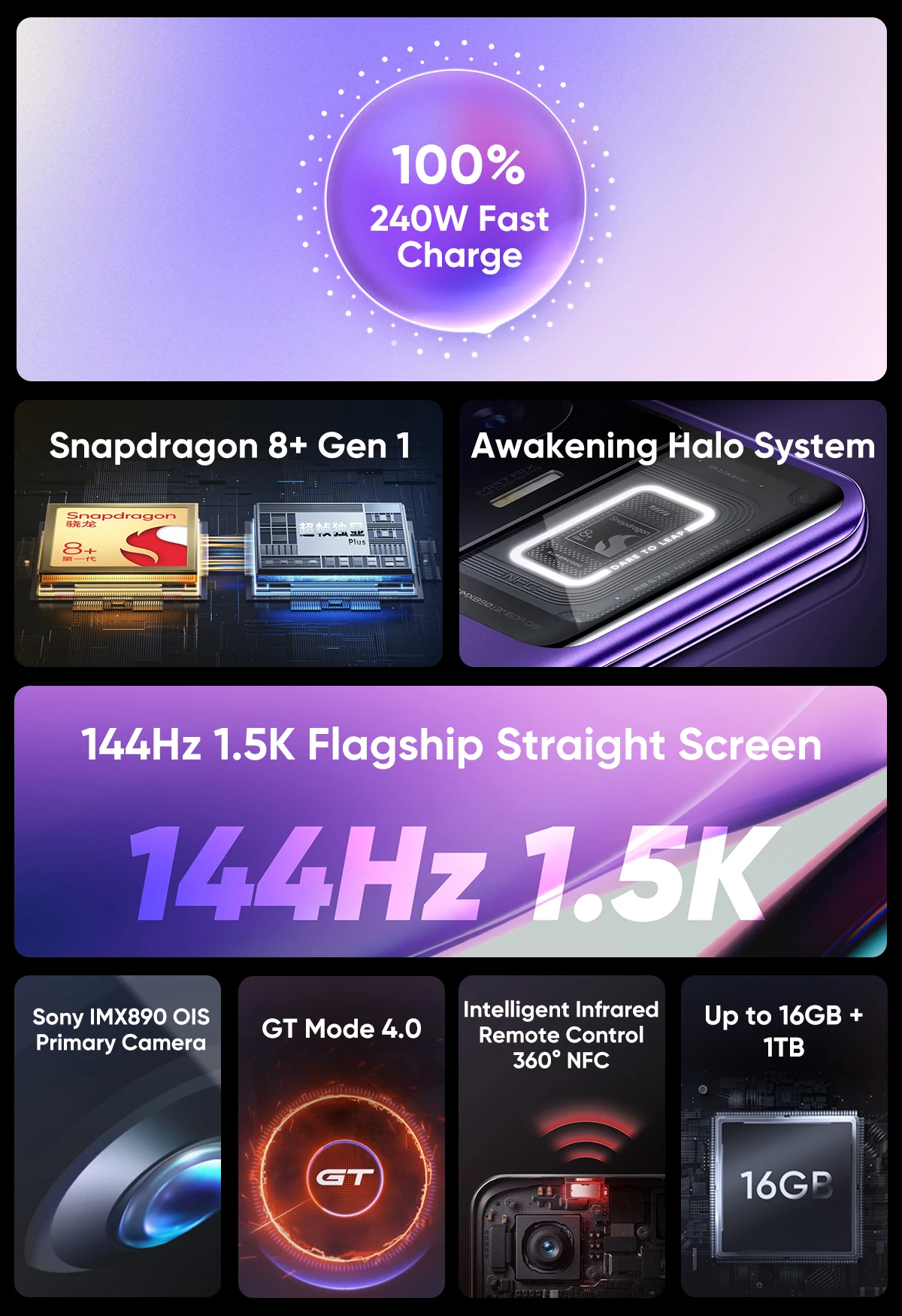 Comprar ROM Global realme GT NEO 5 GT NEO5 5G Snapdragon 8+ Gen 1 240W Carga 144HZ Tasa de refresco 50MP Cámara principal Pantalla 1.5K Teléfono inteligente