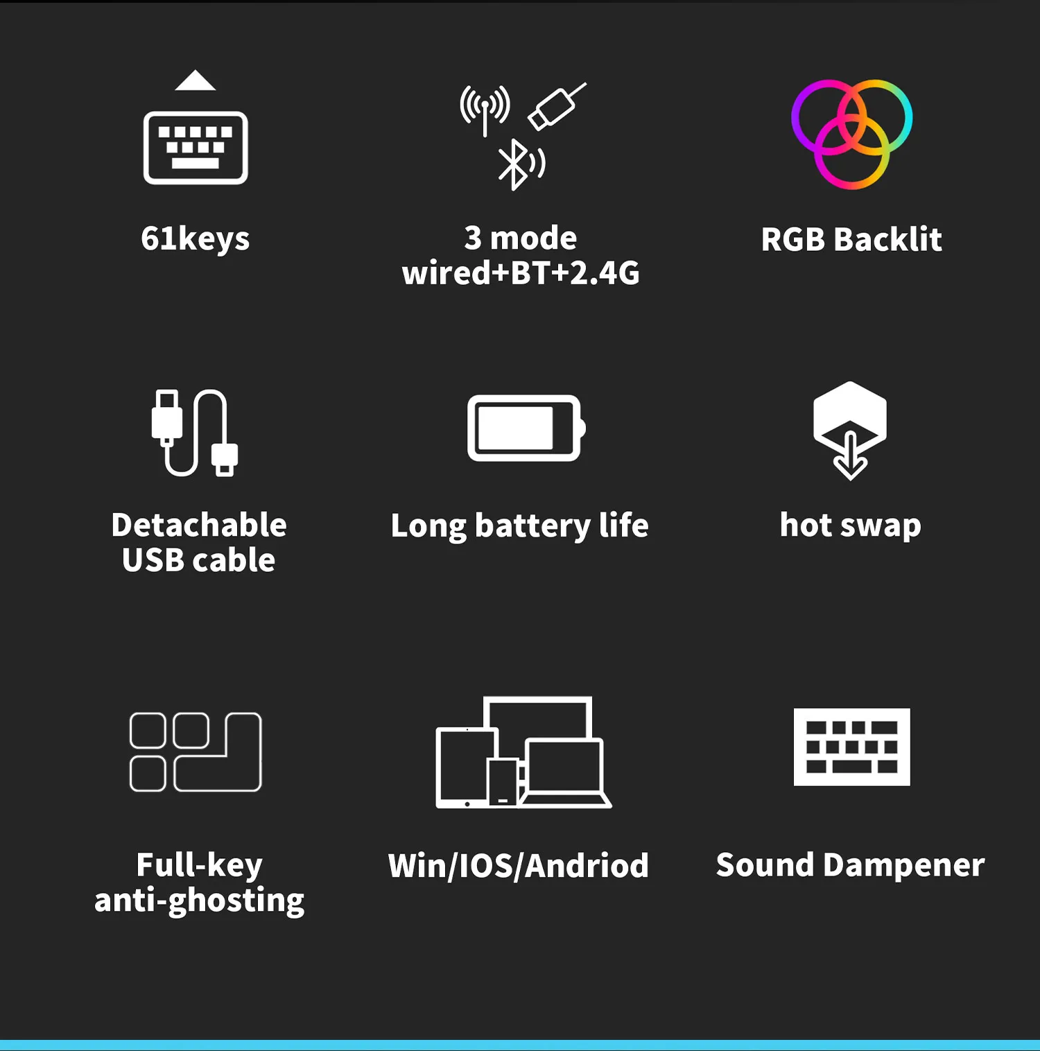1.Mini 60% 61 Key Keyboard - RK61 mini 60% gaming keyboard is a ultra-compact layout with 61 keys makes you a neat desktop with your organized gears on, even folks have nothing to do with Minimalist will dive into its tiny practical design. Tips you might want to know is that keyboard without numpad is most FPS gamers' choice, more spaces left for mouse movements.