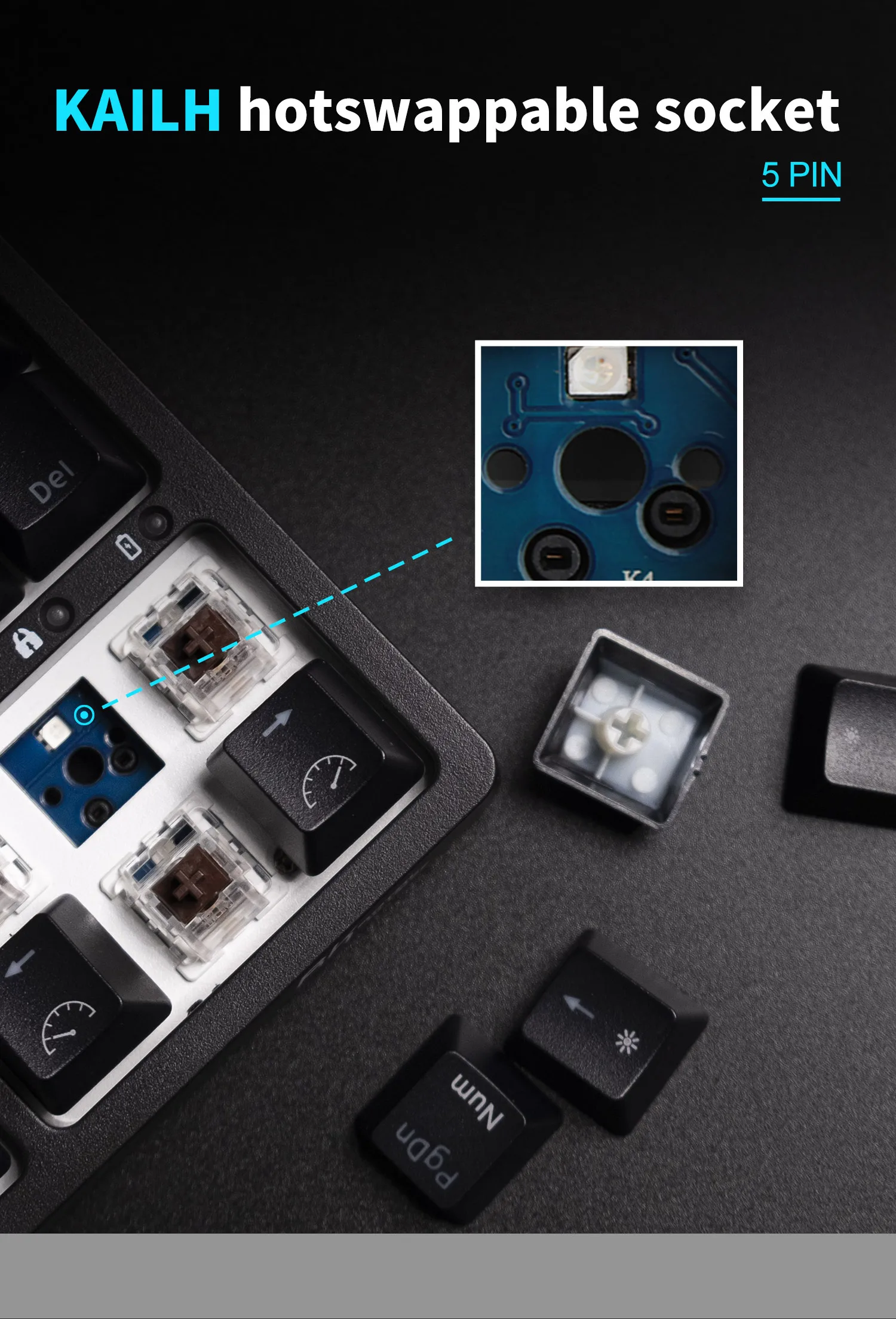 3. Intercambiable en caliente- La PCB de intercambio en caliente le permite reemplazar interruptores de 3 pines/5 pines libremente sin problemas de soldadura.Disfruta de la diversión de crear tu propio teclado único.