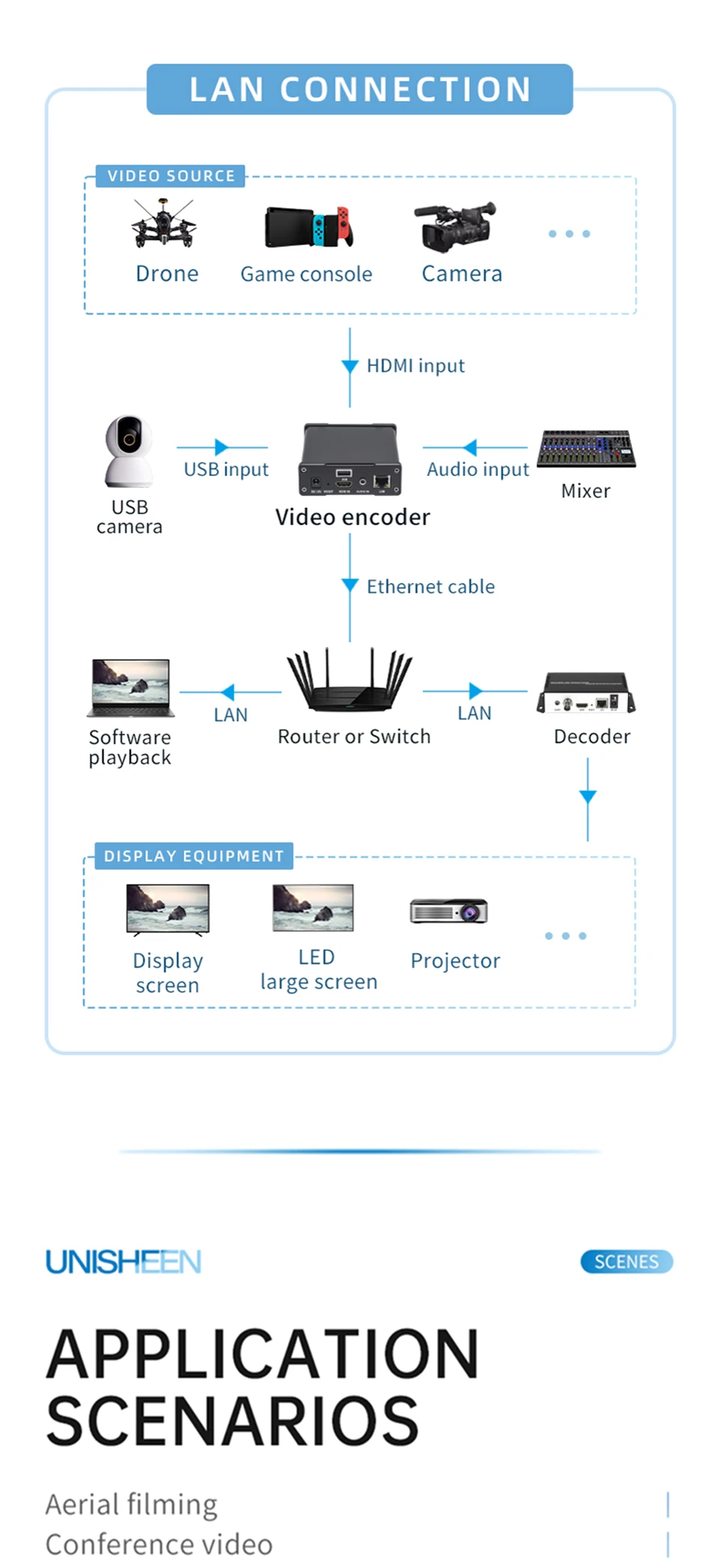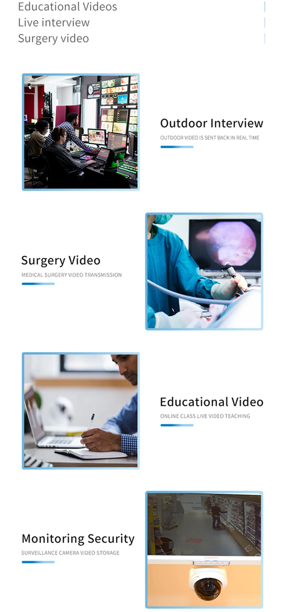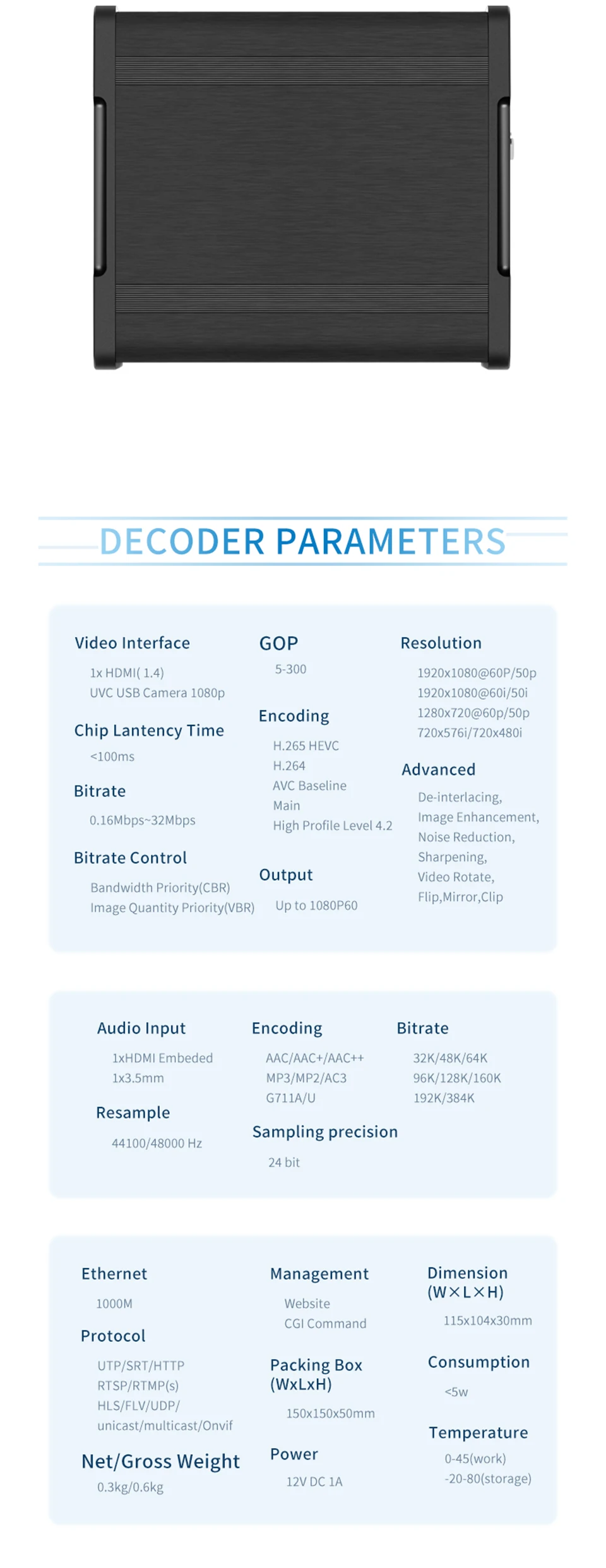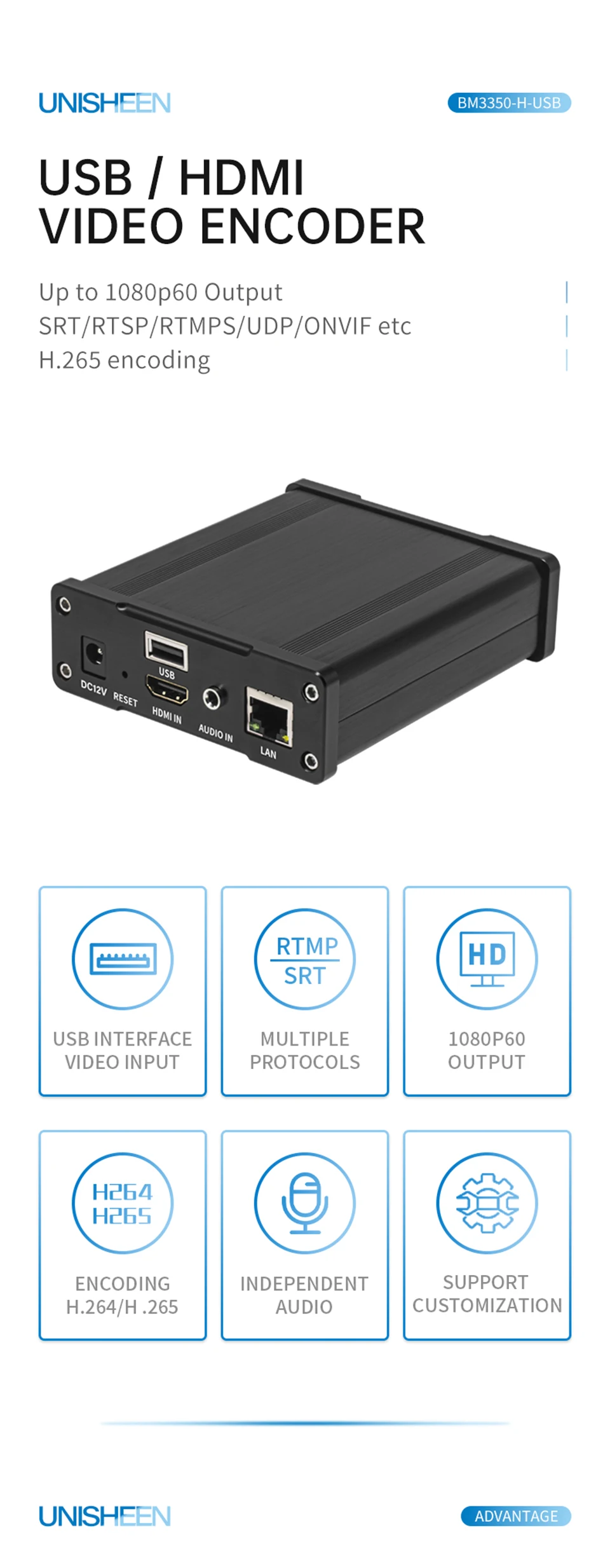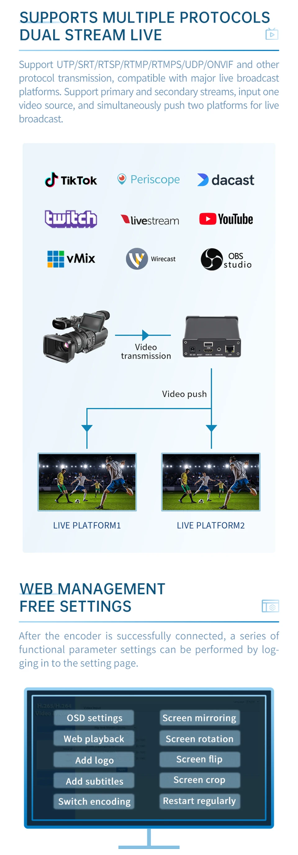 * Compatible con HDMI * Compatible con cámara USB * Compatible con protocolo RTMPS/SRT/RTSP * Rotación de vídeo, giro, espejo, clip * Transmisión de audio o vídeo por separado * Reproducir en el navegador * Personalizable