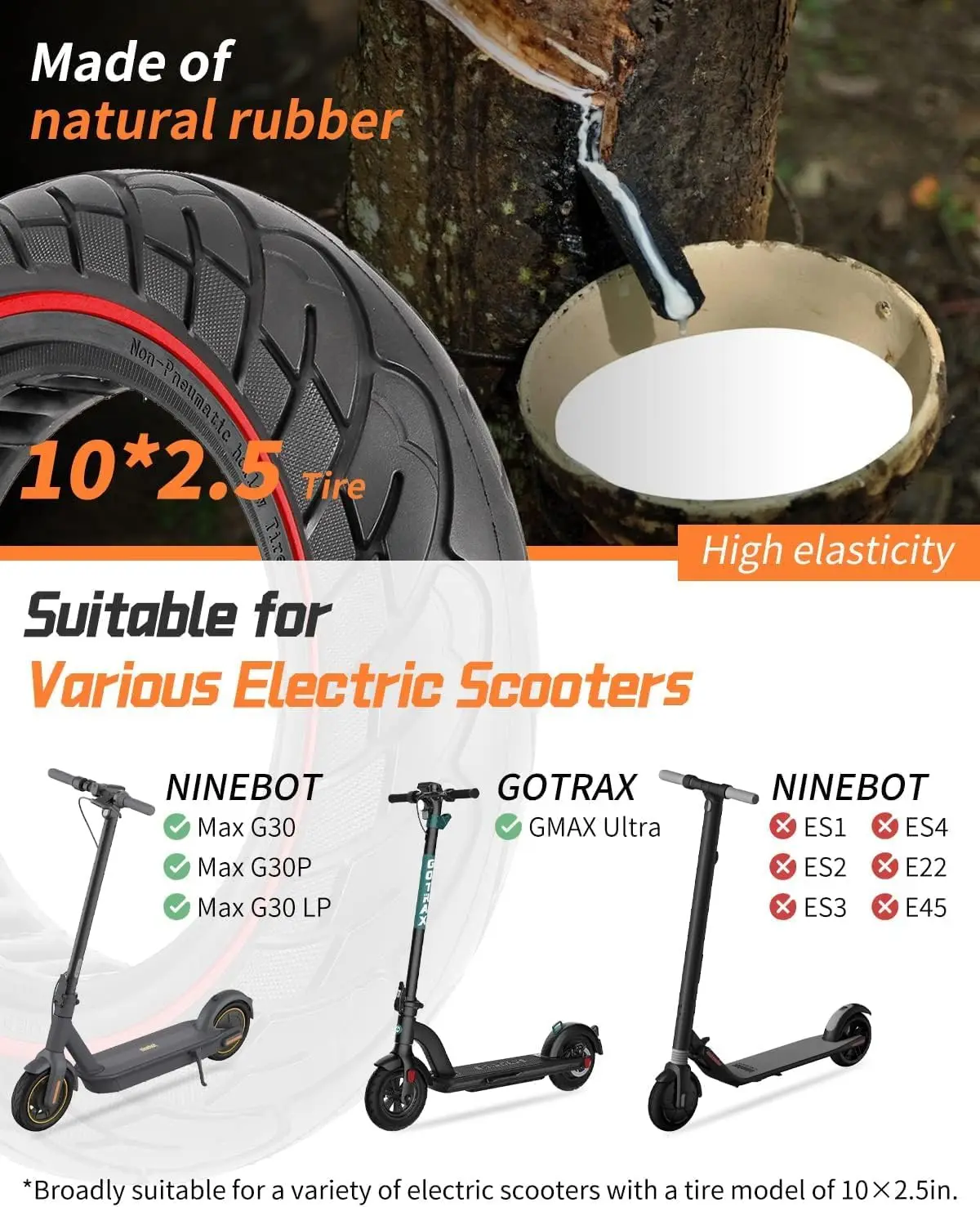 Ampliamente compatible: Rueda Maciza 10x2.50 Pulgadas (Llanta ancho 45mm)Antipinchazo para Patinete Eléctrico,Goma Sólida, Neumático Sólido para Ninebot Segway MAX G30 G30P G30LP , Kugoo M4 M4Pro F40/,hiboy S2 Max / max3 / Titan Pro / Titan / gotex G4 / g Max,Ruedas de 10 Pulgadas 60/70-6.5